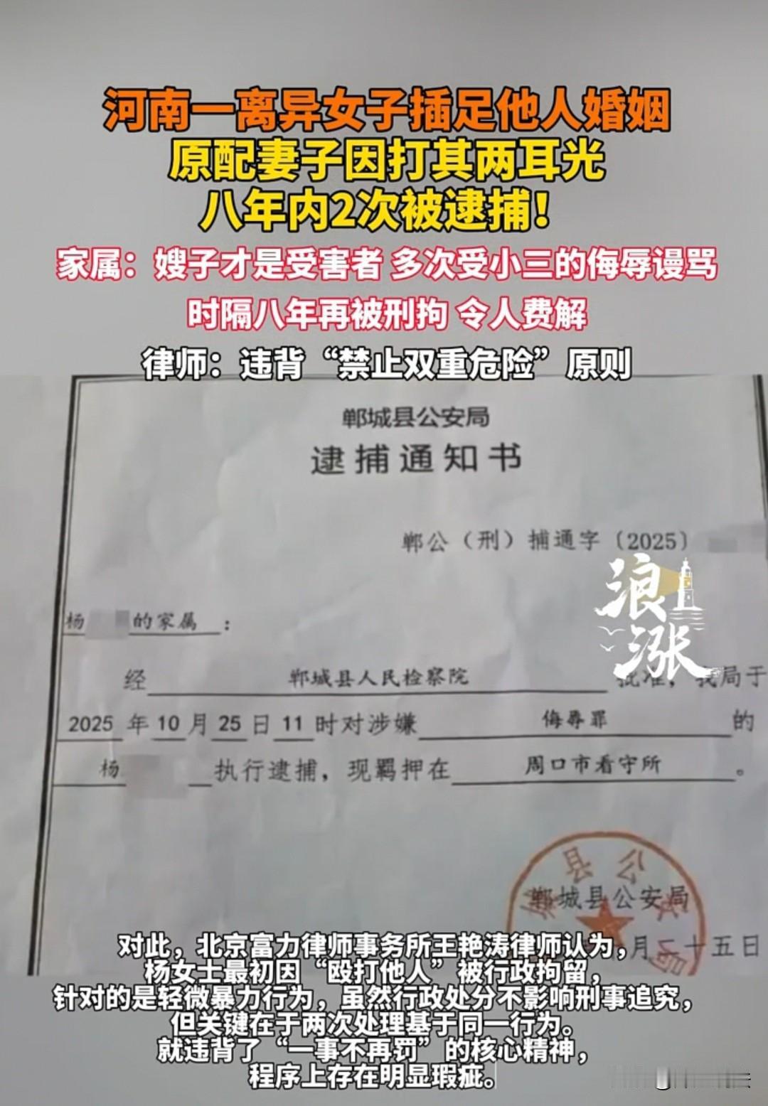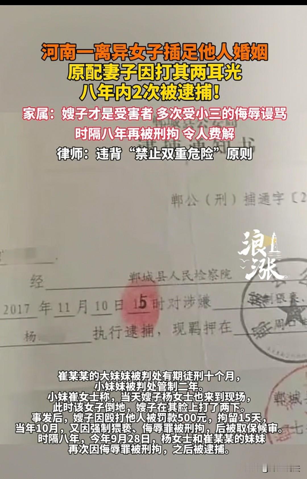 河南,女子打了丈夫婚外交往的对象两下,被行政拘留15天、罚款500元。八年后,该女子又因当时的那件事,以侮辱罪被刑拘。本该遵循“一事不再罚”的原则,却出现了再次追责的情况,引发了网友们的热议。 在2016年,崔某认识了一位离异女子,对方那叫一个风情万种,把崔某迷得不知所措,最后发生了关系。 事后,崔某也很后悔,他并没有想过和妻子离婚,也没有想过和该女子结婚。 但是崔某的工作单位挺好的,工资待遇也不错,这位女子就纠缠着不放,硬要和他在一起。 最后,她还以自己怀孕了,闹到了崔某的单位,最后,经过调解,崔某赔偿了该女子9万。 本以为这个事情就结束了,可是,在2017年6月3日,该女子又找到崔某的妻子杨女士,两人一见面,分外眼红,又争论了起来。 这时,崔某的两个妹妹也赶来支援杨女士,因为在她们心目当中,特别恨该女子破坏自己哥哥的家庭,她们是百分之一百站在杨女士这一边。 结果两位妹妹动作过大,把该女子下身的衣服都给扯掉了,当时杨女士也非常生气,“我不找你,你居然又来找事,谁遇到了不发泄一下呢?”因此就上去在该女子的脸上打了两下。 就因为这两下,杨女士被拘留了15天,还被罚款了500元。 而崔某的大妹妹也被判了十个月有期徒刑,小妹妹被判管制两年。 这让崔某痛不欲生,当初自己的错误,却要让自己的妻子和妹妹来买单。 可该女子这还没有完,觉得她们三人在大庭广众之下扯掉了自己的衣服,是极其侮辱人的行为, 因此,要求以强制猥亵、侮辱罪追究她们的刑事责任,不过后来都被取保候审了。 现在姑嫂三人想想都后怕,怎么遇到了这样的人?对方是上门来挑衅她们的,居然最后受罚的还是自己,这谁能想得通啊? 三人觉得,只怪当时大家的情绪太激动,不小心把衣服给扯掉了,还扇了两下。 不过谁遇到这样的事情,不发泄一番呢?自己哥哥好端端的一家人,被她扰乱成这样,崔某工作单位那么好,被她这么一扰乱,影响前途,怎么想都觉得当时做的没有错。 大家以为这件事终于翻篇了,可是到2025年9月28日,杨女士又因侮辱罪被刑拘,在2025年10月25日,正式下达逮捕令。 她们怎么也想不通,当时在该女子脸上打了两下,妹妹不小心把下身的衣服扯掉了,该判刑的判刑了,该拘留的拘留,该罚款的罚款,怎么这个事情就没完没了呢?怎么时隔八年还要被刑拘? 网友们也看不懂呀! 之前姑嫂都被处罚了,虽然在同年10月,该女子不服气,觉得判罚太轻,才又以强制猥亵、侮辱罪刑拘了她们,不过都取保候审了,本应该了结了呀。 怎么这时隔八年又来一招? 法律人士也表示,“一事不再罚”,之前已经处罚过了,就不应该再处罚,此次适用的条款显然是有错误的。 不过直到现在,相关部门还没有给出具体的说明。 一、“一事不再罚”原则的适用争议 该原则禁止对同一违法行为重复给予同类处罚,但不排除行政责任与刑事责任的衔接——若违法行为已达刑事标准,可在行政处罚后追究刑责。 但本案中,杨女士2017年打耳光的行为已被行政拘留,崔某的大妹妹被判处有期徒刑十个月,小妹妹被判处管制两年,二人已被依法追究刑事责任,三人的行为均已接受过完整的法律评价。 2025年时隔8年,再以同一行为对杨女士及崔某妹妹重启“侮辱罪”追责,违背核心逻辑:同一行为的社会危害性未发生变化,重复追责既突破了“禁止双重危险”的司法精神,也违反“一事不再罚”原则,程序上存在明显瑕疵。 二、罪名定性的界限与合理性 本案中崔某妹妹的行为曾涉及“强制猥亵、侮辱罪”与“侮辱罪”,二者差异显著:前者侵犯性自主权,需具备性意味的强制行为;后者侵犯人格尊严,表现为公然贬低他人名誉。 妹妹撕扯对方下身衣物的行为,虽具有公然侮辱属性,但已在2017年以“侮辱罪”作出刑事判决(大妹有期徒刑十个月、小妹管制两年),且无证据显示该行为具有性侵犯意图,不构成“强制猥亵、侮辱罪”。 如今再以同一行为重复追究“侮辱罪”,不仅定性无新意,且未达到“新情节、新危害”的重启追责标准,缺乏实质依据。 三、处罚时效与程序正义的双重考量 侮辱罪的追诉时效通常为5年,崔某妹妹的行为已被定罪且过追诉时效,杨女士的行为同样时隔8年,均未出现新证据或法定事由,此时重启追责违背追诉时效制度“稳定社会关系、避免无限期追责”的立法初衷。 法律人士指出,行政机关与司法机关的处罚需遵循“一事不再罚”的程序约束,姑嫂三人的行为早已通过行政处罚、刑事判决(崔某妹妹)全面评价,且处罚力度与行为危害性相匹配,不应重复启动刑事程序。 对于此事,大家如何看待? 素材来源于:新黄海2025年11月6日报道