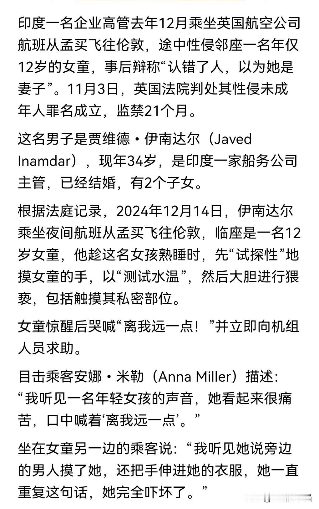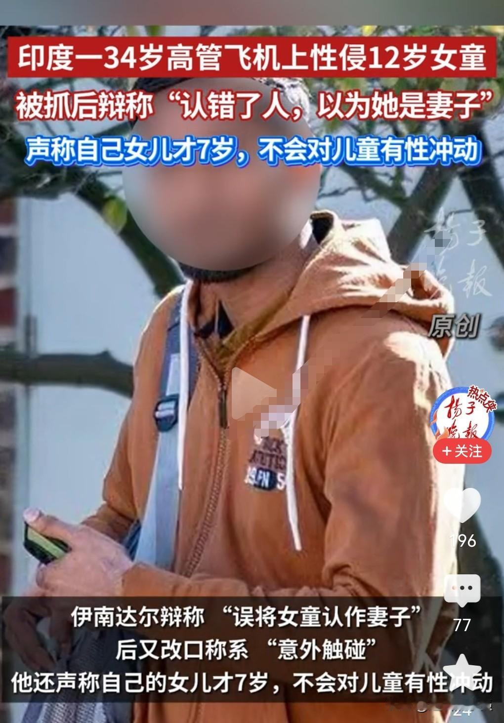 这确实太令人发指了,众所周知,印度是一个强奸高发的国家,猥亵也是经常发生。 11月6日在网上看到这么一个事情。 印度男子飞机上性侵邻座女童,女童被弄醒后,立马向机组人员求助。 这非常的聪明,必须要求助,要不然的话就危险了。 男子下飞机就被抓了。 这男的竟然谎称把女孩当成了妻子。 男子最终被判监禁21个月。 这真是大快人心。 敲响了警钟,千万别做违法犯罪的事。