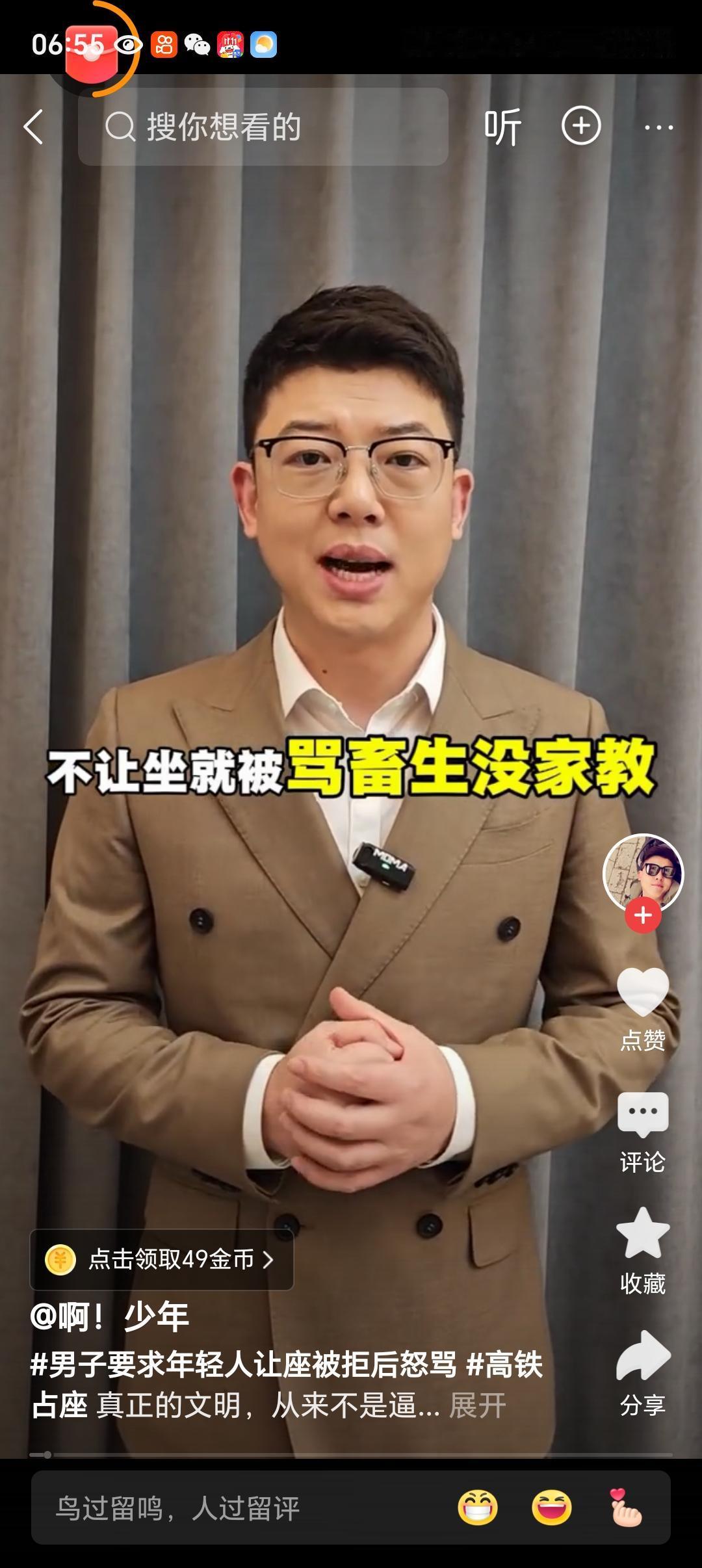 无座票也妄图落座?成都高铁让座风波凸显边界难题,年轻人霸气回怼背后释放何种信号 11月4日,四川成都的高铁上上演了一起让座事件:一名光头男子持无座票,要求座位上的年轻人让座。遭拒后,他辱骂年轻人,而年轻人冷静有力地回怼化解了冲突。此类事件再度将“让座”话题推至舆论焦点:让座该是出于自愿善意,还是会被道德标签强制推行?公众反感的并非同情弱者,而是担忧“道德绑架”与个人边界被侵犯。 关键在于明确边界与权责。无座票并不意味着拥有优先获得座位的权利,坐席分配是依据票务和车厢容量的实际情况而定。让座应基于自愿、可选择且可撤回的原则,而非将“善意”当作评判他人品格的施压工具。反之,若有人以侮辱羞辱的方式来获取座位,很容易让善意成为冲突的导火索,激化矛盾。 公众对“道德绑架”的厌烦,反映出对情绪化、强制性善举的抵触。许多年轻人并非不愿让座,而是不想被道德标签束缚。一个健康的社会氛围,应鼓励自愿协作、尊重边界,并提供切实可行的制度保障,而非将“好人”置于道德审判的境地。 解决办法需“双管齐下”。制度方面:增加运力、设立明确的优先席,完善现场指引和工作人员介入机制,降低冲突发生几率;个人方面:面对让座请求,先礼貌沟通、说明缘由并给出替代方案,比如“我现在无法让座,可请工作人员帮忙安排或去站立区”。同时,交流时避免人身攻击,拒绝时保持尊重与克制。善意的本质是自愿、可控、可撤回的合作,而非情绪化的强制博弈。 你如何看待这起事件?身边是否也有“强硬要求让座”的情况?怎样在不侵犯边界的前提下,既鼓励善举又保障个人权益?欢迎在评论区分享你的经历与看法,下次遇到类似情况,你会怎么做?让座纠纷 高铁低素质行为