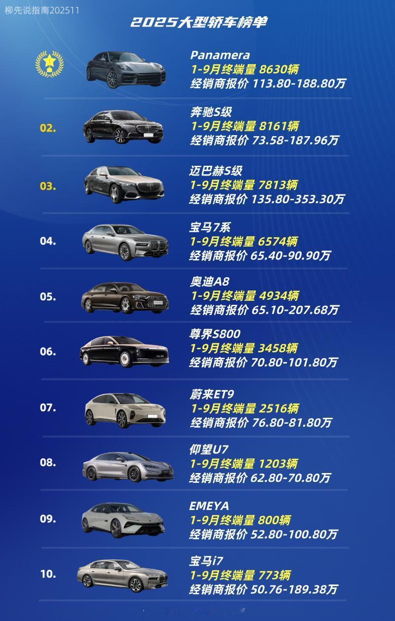大尺寸豪华轿车 大型轿车TOP10 第十名:宝马i7 第九名:EMYA 第八名:仰望U7 第七名:蔚来ET9 第六名:尊界S800 第五名:奥迪A8 第四名:宝马7系 第三名:迈巴赫S级 第二名:奔驰S级 第一名:Panamera 保时捷Panamera位居榜首,今年1-9月终端销量8630辆。【来自懂车帝车友圈】