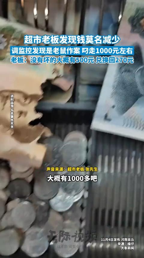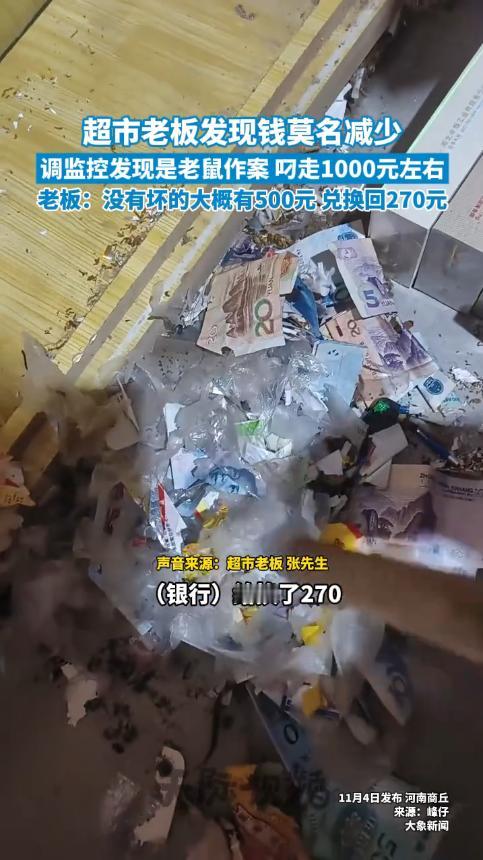“悲剧还是发生了!”11月4日,河南商丘,一超市老板点钱时,发现钱柜里的钱每天都在减少,于是就调取了监控,发现竟是老鼠干的!他从老鼠洞里找出1000多元现金,但是有一半被咬碎了,去银行只换了270元,网友:是只财迷鼠![得意] 河南商丘一家超市的老板张先生,最近发现钱柜里的现金天天变少,门窗却都完好无损,一查监控,真相让人哭笑不得,作案者竟是只灰扑扑的老鼠。 监控里,这小家伙熟门熟路地溜进钱柜,叼起纸币扭头就跑,一溜烟钻到货柜底下没了影,张先生顺着痕迹找过去,从老鼠窝里掏出一千多元,可惜近一半都被咬成了碎片,最后他带着残币去银行,只换回了270元,这事儿传到网上,网友都乐了:“这老鼠还挺识货,专挑人民币下手!” 虽然老鼠偷钱不算常见,但它们的破坏力确实不容小觑,养过仓鼠的人都知道,老鼠的门齿终身生长,必须不断啃咬硬物来磨短,木材、电线、塑料管,甚至水泥墙它们都能下嘴,更别说脆软的纸币了。 更让人头疼的是它们的繁殖能力,一对老鼠一年下来,子子孙孙能发展到上千只,要是你在家里同时看到两只老鼠,那很可能暗处还藏着二十只。 超市、仓库和厨房这些地方,尤其要重视防鼠,它们总能找到你意想不到的入口——空调管道缝隙、门框边缘、通风口,哪怕是拇指宽的缝,它们也能挤进来。 首先得全面检查墙体、地面和天花板,找到所有可能的入口,用钢丝球塞进缝隙,再灌上发泡胶或者抹上水泥,这样坚固又持久。 食物残渣要及时清扫,垃圾不过夜,货品最好离地存放,杂乱的空间和积存的纸箱,都是老鼠理想的安家之处。 老鼠的麻烦,不同地方、不同经历的人,肯定各有各的体会,新闻一出,评论区的网友们炸开了锅,纷纷开启吐槽模式。 "这老鼠怕不是成精了,还知道挑值钱的叼,下次是不是该偷金条了?" "超市老板真是又倒霉又幸运,倒霉的是钱被咬了,幸运的是好歹还找回一部分,要是一分不剩那才叫惨。" "看来以后钱柜也得做防鼠处理了,老鼠不光偷吃的,连人民币都不放过,真是防不胜防。" "我在老家开小卖部也遇到过,老鼠把整条烟都咬烂了,损失比这还大,现在店里常年放着粘鼠板。" "银行能给换270元已经不错了,我记得残币超过一半面积才能换,这老板算是不幸中的万幸。" "老鼠的牙齿确实厉害,连电线都能咬断,更别说纸币了,家里有老鼠的真的要赶紧处理。" "我们小区最近也在统一灭鼠,物业说秋天老鼠容易往楼里跑,大家最好检查一下空调管道缝隙。" "这老鼠估计是把钱当垫窝的材料了,动物世界里说过老鼠就喜欢用软东西做窝。" "建议超市老板买个带锁的铁皮钱箱,一劳永逸,塑料抽屉根本防不住老鼠。" "我们这边农商行经常开展残币兑换服务,其实很多老人不知道破钱能去银行换,应该多宣传。" "看完赶紧检查了我家零食柜,果然发现老鼠屎,立马下单了超声波驱鼠器,希望有用。" "老鼠繁殖太快了,一窝能生七八只,两个月又能接着生,所以发现必须马上消灭。" 你在家里或工作场所遇到过老鼠困扰吗?有没有什么独家的防鼠灭鼠妙招?欢迎在评论区分享你的实战经验! 信源:大象新闻