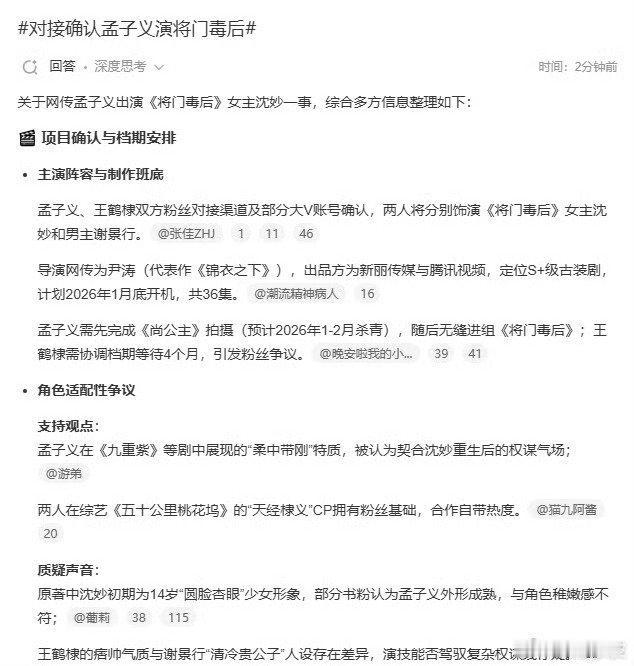 王鹤棣孟子义或将首搭主演古装剧《将门毒后》;孟子义或演沈妙,王鹤棣或演谢景行。期待正式官宣! 将门毒后