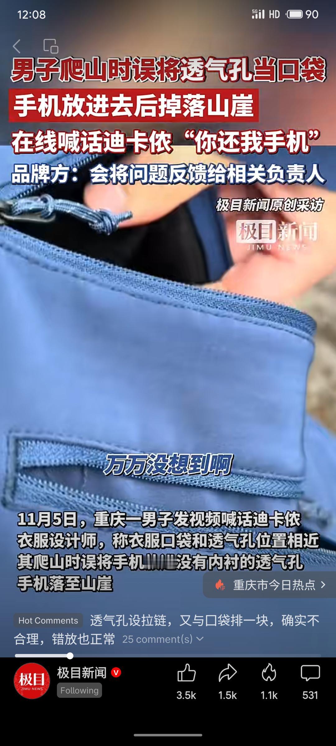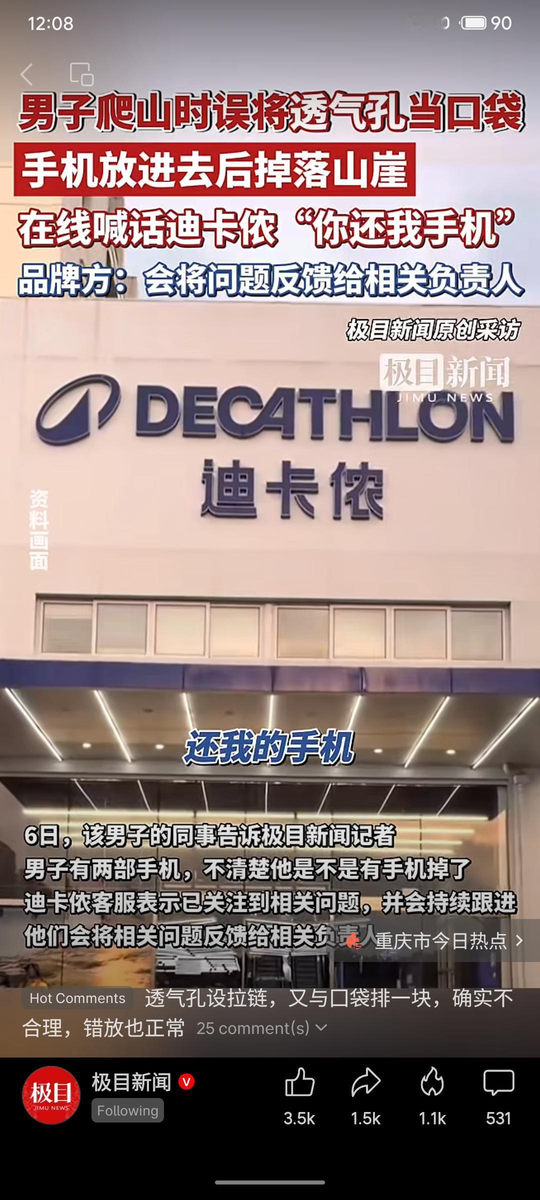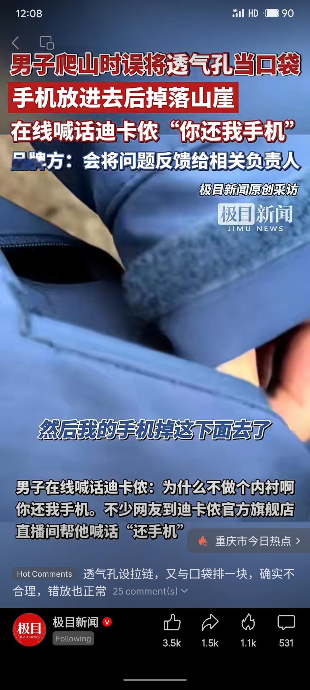 一名重庆男子爬山时,误将户外服装的透气孔当作口袋放入手机,导致手机滑落山崖。事后他公开质疑迪卡侬产品设计,认为透气孔与口袋位置相近且无内衬易致误操作。品牌方回应将反馈问题,部分网友也认为该设计存在缺陷。