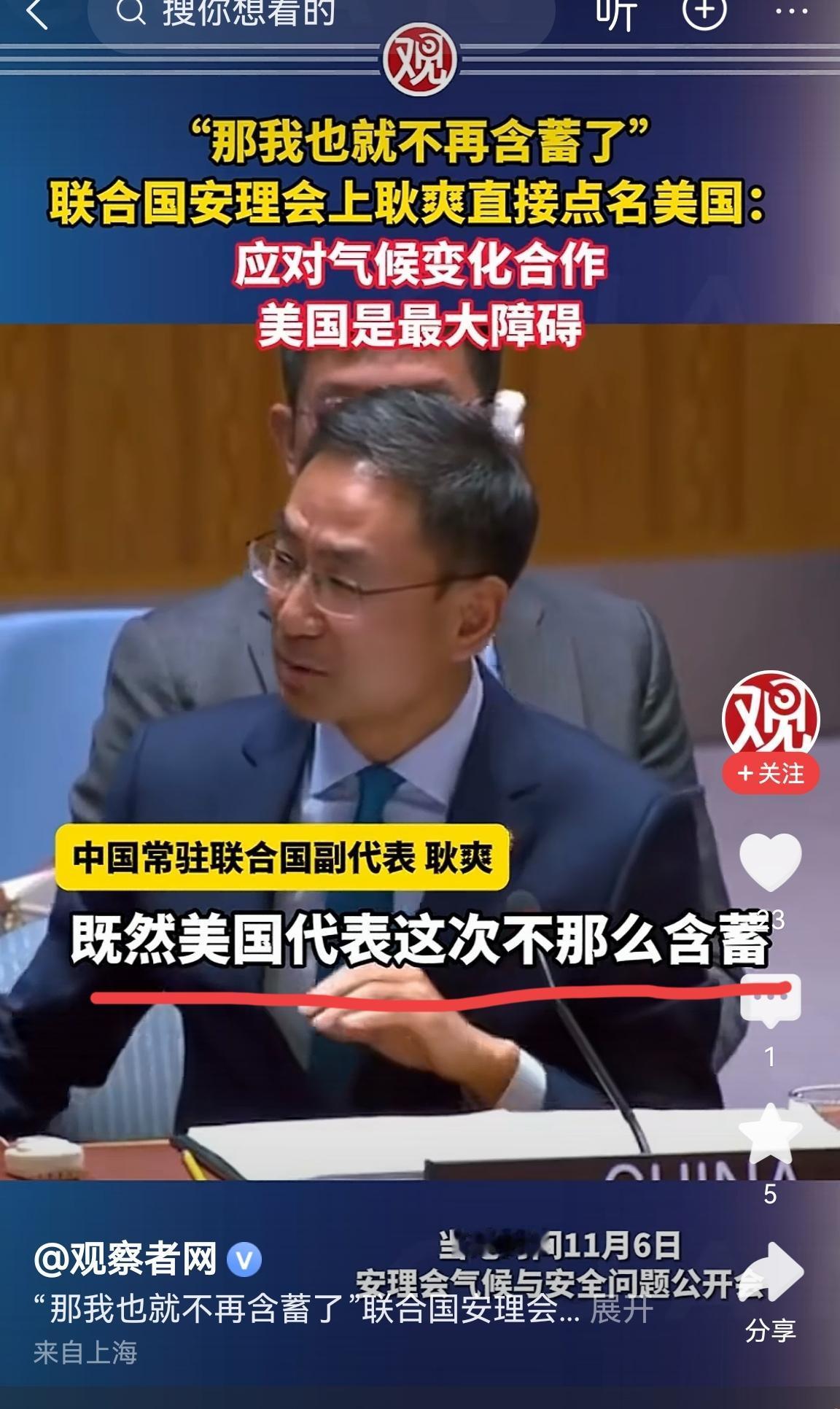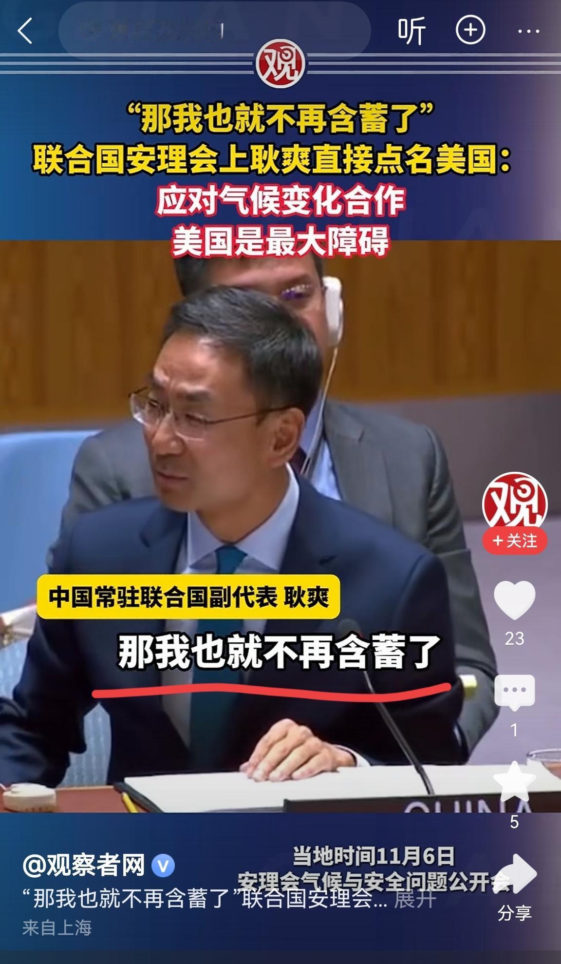既然老美代表不那么含蓄直接点名了,那我也就不含蓄了。 驻联合国代表耿爽又给老美上了一节环保问题课。 面对老美双标的指责,耿爽直接教对方做人。 一个公然宣称气候变化是人类最大骗局的国家, 一个两度退出应对气候变化《巴黎协定》的国家, 一个已经成为全球应对气候变化合作最大阻碍的国家, 自己不去减排,却来指责应对气候变化合作模范生的中国。 网友感叹:老美心真大,这就等于学渣强烈要求由自己来指导学霸学习。