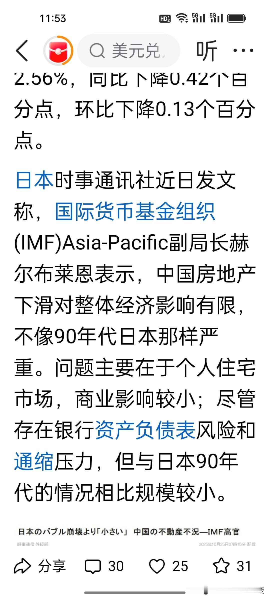 日媒对于中国房地产市场讲了句大实话!《环球网》引用日本时事通讯社报道,根据国际货币基金组织官员分析,中国房地产下滑不像90年代的日本那么严重。原因是个人住宅市场的商业影响比较小,跟日本当年的情况不一样。 这两天,因为中国银行研究院发布报告的全国平均住房断供率3.7%的这个数据,很多券商都在咨询我对银行的影响以及对银行股的影响。 其实,今年的财政政策加码发力,货币政策比较宽松,国家正靠“白名单”融资支持、保交房+因城施策,加速稳市场。银行不良率可控且有政策托底,守得住系统性风险,银行股也依旧是大盘慢牛的助推剂,短期波动不改长期稳健底色。