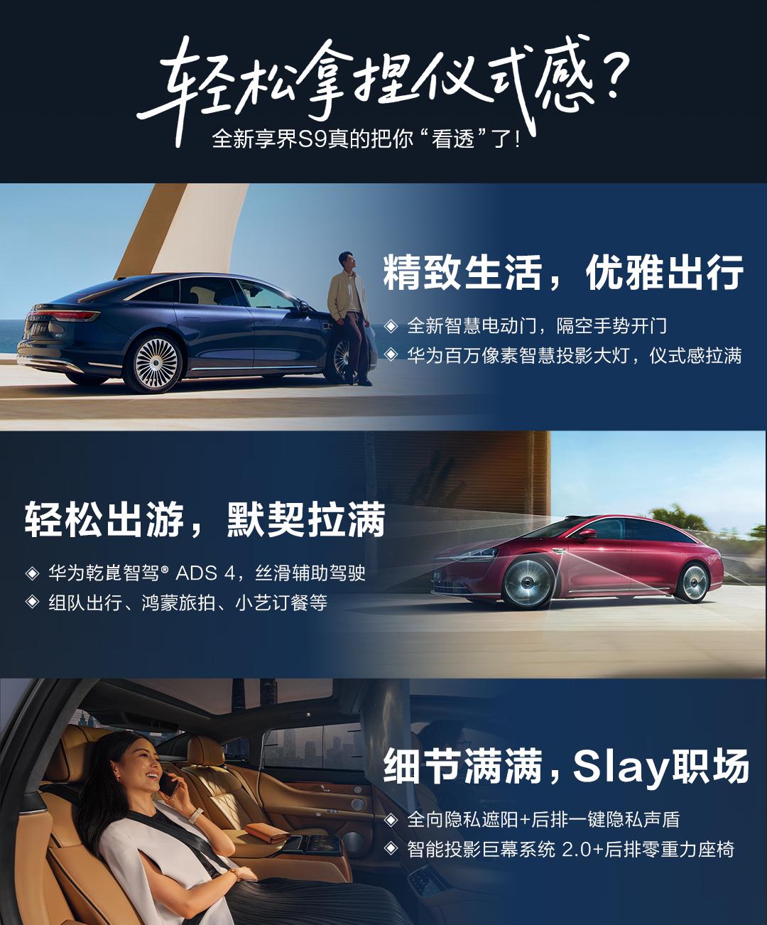 随着现在的消费者越来越理性,很多用户在选购车辆时,不仅注重高颜值,也追求豪华内饰与先进科技配置。鸿蒙智行正是符合这一趋势的代表之一,近年来市场表现十分亮眼。在该系列中,享界品牌尤为突出,如今新款享界S9已正式开启预售,以31.8万元起的售价配合多项购车权益,趁着还有购置税减免的时机,现在入手最为合适。对了,余承东也官宣了这辆车的上市时间,11月20日,对其还不太了解的也可以等正式上市时间。 作为一款高端车型,新款享界S9在外观上融合美学与科技感,配备寰宇之星车标与星云尾灯,结合高端配色,整体风格豪华时尚。车内拥有1962mm的奢阔空间,满员乘坐依然宽适。更全系标配座椅通风、加热与按摩功能,前排副驾与后排均提供零重力座椅(二选一),配合华为途灵平台,无论长途出行或颠簸路况,皆能保证乘坐舒适性。 科技方面,新款享界S9同样出众。车内配备超过十块屏幕,搭载全新智慧电动门,以及36个高精度传感器,并搭载华为乾崑智驾ADS 4系统,不仅带来全新交互体验,也提升了行车与泊车安全性。 综合来看,新款享界S9在造型、科技、舒适等方面均表现卓越,在30万元级别市场中,其产品力表现突出。这也是为什么这么多高知用户愿意选择享界这个品牌的原因,除去华为背书之外,也都是在为享界新豪华科技体验买单。新款享界S9开启预售31.8万元起 余承东官宣新款享界S9上市时间