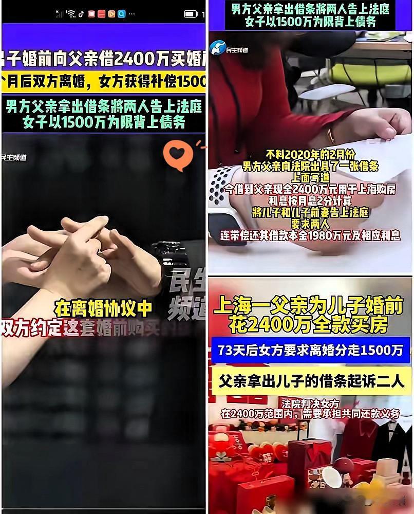 上海爸爸掏2400万给儿子买婚房, 小两口过73天 女方就要离婚还想分1500万,最后靠借条让女方共同还钱。 这事儿可不是算计,就是给父母的血汗钱上个保险啊! 好多父母攒一辈子钱给孩子买房,总觉得谈钱伤感情,结果婚离了钱也没了。 提前写借条说明是借款,既合法,也不影响好好过日子。真打算好好过的,谁会在乎这形式?我觉得给子女买房,提前把财产规则讲明白太有必要了。
