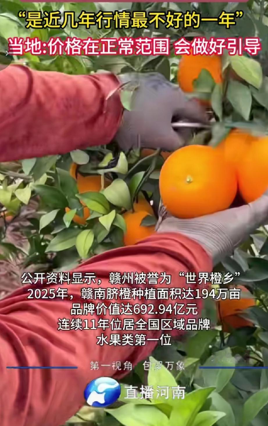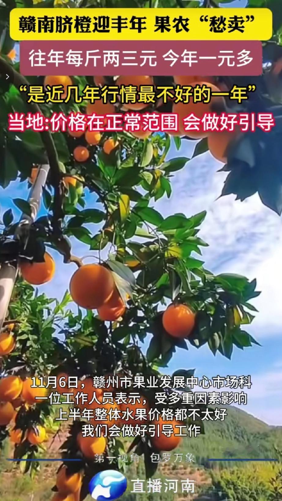 近期赣南脐橙迎来丰收年,果实品质比往年好,但出价格确不是很理想 往年脐橙收购价每斤两三元,今年经销商的收购价仅每斤一元多,果农称这是近几年行情最不好的一年。 当相关部门地表示价格在正常范围,会做好引导工作。赣州市果业发展中心市场科工作人员称受多重因素影响上半年整体水果价格都不太好,会做好引导工作。(来源于@直播河南)