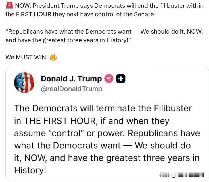 特朗普总统警告,民左党在下一次掌控参议院的第一小时内就会结束阻挠议事(filibuster)。 他说:“共和党掌握了民左党想要的东西——我们现在就应该行动,让接下来的三年成为历史上最伟大的三年!”