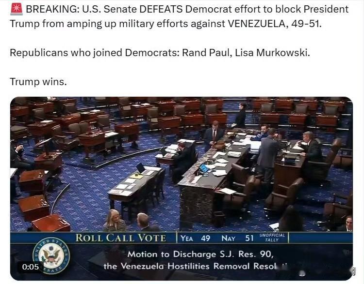美参议院以49票对51票,否决了民左党阻止特朗普总统加强对委内瑞拉军事行动的提案。 加入民左党阵营的共和党议员包括:兰德·保罗和丽莎·穆尔科斯基。