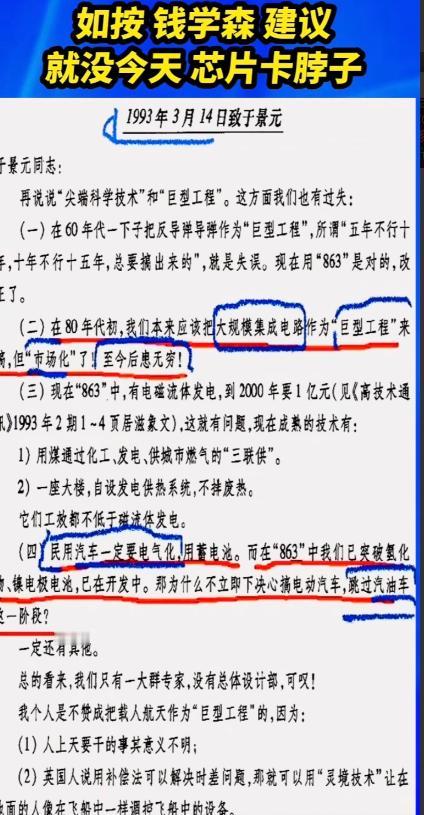 钱学森“神一般”的建议!32年前,钱老关于“尖端科技”和“巨型工程”的建议,成功预见到今日之中国现实。 1993 年,他就在给相关部门的报告里明确提出,中国必须集中力量搞 “上天、入地、下海” 三类巨型工程,哪怕短期内看不到回报也要坚持。 那会儿国内正忙着搞经济建设,不少人都觉得这建议太 “烧钱”了,甚至有声音说 “这还不如先解决吃饭问题呢”。 没人能想到,这份被质疑 “不切实际” 的方案,竟精准画出了今日中国的科技版图。 要说当年的争议那是相当激烈啊。 90 年代初,全国财政收入刚过千亿,有人算过一笔账,搞载人航天工程的投入,能盖几万个希望小学。 钱老在内部会议上直接反驳这种短视观点,他拿 50 年代搞 “581 工程” 举例 —— 当年有人觉得人造卫星不如拖拉机实用,可正是那项工程带出了火箭、材料、电子等一系列技术突破,后来全用到了工业生产里。 这番话点醒了决策层,也定下了 “以大工程带小技术” 的思路。 其实钱老的建议里藏着一套 “技术树” 逻辑。 他不主张零散搞研发,而是要靠巨型工程当 “主干”,催生出无数 “分支技术”。 就说 “上天” 这块,他力主的载人航天工程,光一个航天员出舱服就涉及 200 多个技术领域,其中新材料技术后来用到了高铁刹车片上,生命保障系统的原理被借用到医疗呼吸机研发中。 这种 “一棵大树结出百样果” 的效果,比单独砸钱搞某项技术划算多了。 “入地” 和 “下海” 的布局那是更显远见了。 他建议重点突破深地钻探和深海探测技术,那会儿石油、矿产勘探还依赖国外设备,深海更是一片空白。 现在再看,咱们的 “地壳一号” 能钻到地下万米,深海探测器能下潜到马里亚纳海沟,这些技术不仅保障了资源安全,还催生出高端装备制造产业。 我前阵子去青岛港,看到自动化码头的起重机用的就是当年深海探测衍生的精密控制技术,操作人员说这设备比国外的还耐用,这话听着心里特自豪。 国际上对这套逻辑也是从质疑到佩服。 当年美国航天专家嘲讽 “中国想一步登天”,觉得没有他们的技术转让根本搞不成。 可钱老早想到了 “自主闭环”—— 建议里明确要求每个关键环节都要有备份方案,不能被人卡脖子。 对比现在美国对芯片产业的打压,才明白这种 “全链条自主” 的远见有多重要。 俄罗斯航天专家后来坦言,他们就是少了这种系统性布局,才导致近几年技术断层。 有人觉得搞巨型工程是 “举全国之力办大事” 的惯性,这理解太浅了。 钱老的建议里藏着 “性价比密码”。 他算过,每投入 1 块钱到航天工程,能带动 10 块钱的相关产业产出。 就像高铁,当初有人觉得票价贵没人坐,现在不仅成了出行标配,还把列车制造、轨道建设技术卖到了全世界。 这种 “先投入后收获” 的模式,比跟着别人后面买技术省钱多了。 你们发现没,钱老的远见不止在技术本身。 他在建议里特别强调 “培养青年人才”,要求每个工程都要带起一支年轻团队。 现在航天、深海领域的核心骨干好多都是 80 后、90 后,正是当年那批跟着老专家干活的年轻人。 我认识个航天工程师,他说刚入职时参与的首个项目,就是钱老当年亲自审定的子课题,这种传承比任何技术资料都珍贵。 那些当年被骂 “浪费钱” 的投入,现在都成了最硬的底气。 没有当年的载人航天积累,就没有今天的空间站;没有深地钻探技术突破,油气资源勘探就得看别人脸色。 这跟咱们攒钱买房一个道理,当下紧点没关系,长远看是给未来铺路。 钱老当年说 “短期阵痛换长期安全”,现在才算真正读懂这句话的分量。 科技发展从来不是急行军,需要有人站得高、看得远。 钱老的厉害之处,在于他既懂技术原理,又懂国家发展的节奏,知道哪些领域必须咬牙坚持,哪些可以循序渐进。 这种 “既要低头拉车,也要抬头看路” 的智慧,不管是搞科研还是干事业都适用。 咱们今天享受的科技便利,从手机导航到高铁出行,背后都藏着老一辈科学家的远见。 他们当年顶着质疑做的决定,不是为了当下的掌声,而是为了几十年后的国家安全和发展。 这种 “功成不必在我” 的格局,值得每个人学习。 做事多些长远眼光,少些急功近利,或许就是对他们最好的致敬。 信息来源: 新浪财经——2025年02月19日钱学森32年前建言我国发展电动汽车:预言准确度让网友拜服!