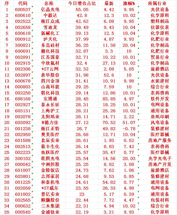 11月7日,增仓占比最多的35名单汇总一览 亿晶光电:今日增仓占比55.05