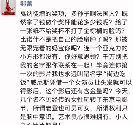 但是郝蕾不同,她开着表演培训学院赚那些二代们的钱,不靠演戏吃饭,那些大佬们拿捏不了她,所以她敢出来仗义执言,说的就是现在的电影节不纯粹了。