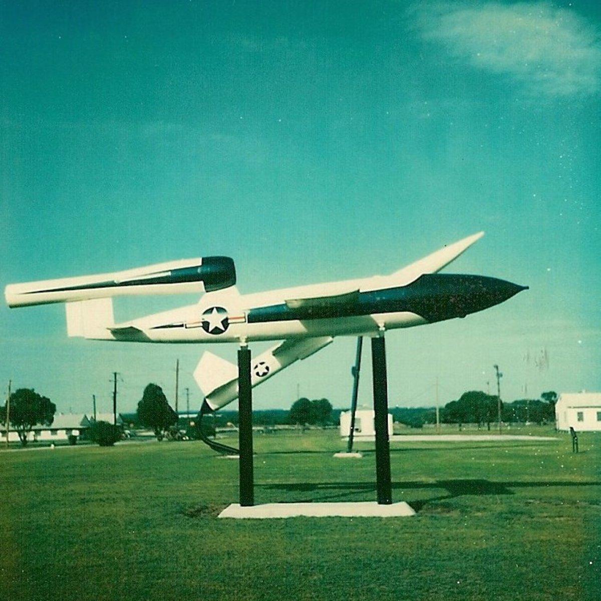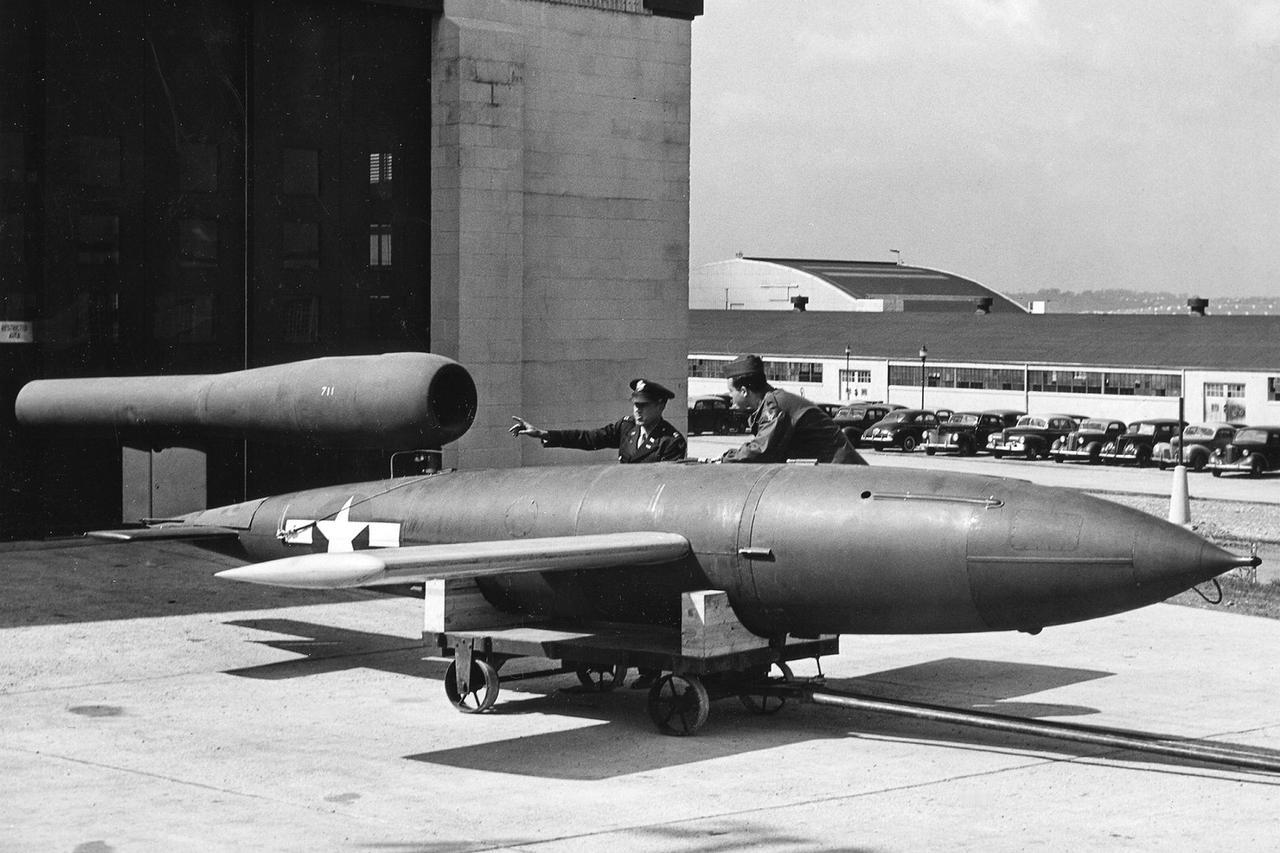 [呲牙] 哟?这是什么?美制 V-1?1945年,美国,俄亥俄州,莱特-帕特森基地。美军正在测试在德国缴获的V-1飞弹。初期是缴获的实弹以及用德制零件组装的,后期根据图纸仿制生产了一批。 V-1飞弹是纳粹德国研制的世界首款巡航导弹,配备脉冲喷气发动机,可携带850公斤战斗部飞行250公里,1944年6月首次用于轰炸伦敦。 莱特-帕特森基地是二战期间及战后评估缴获轴心国武器装备机构的驻所地,实验了多种“新式装备”。