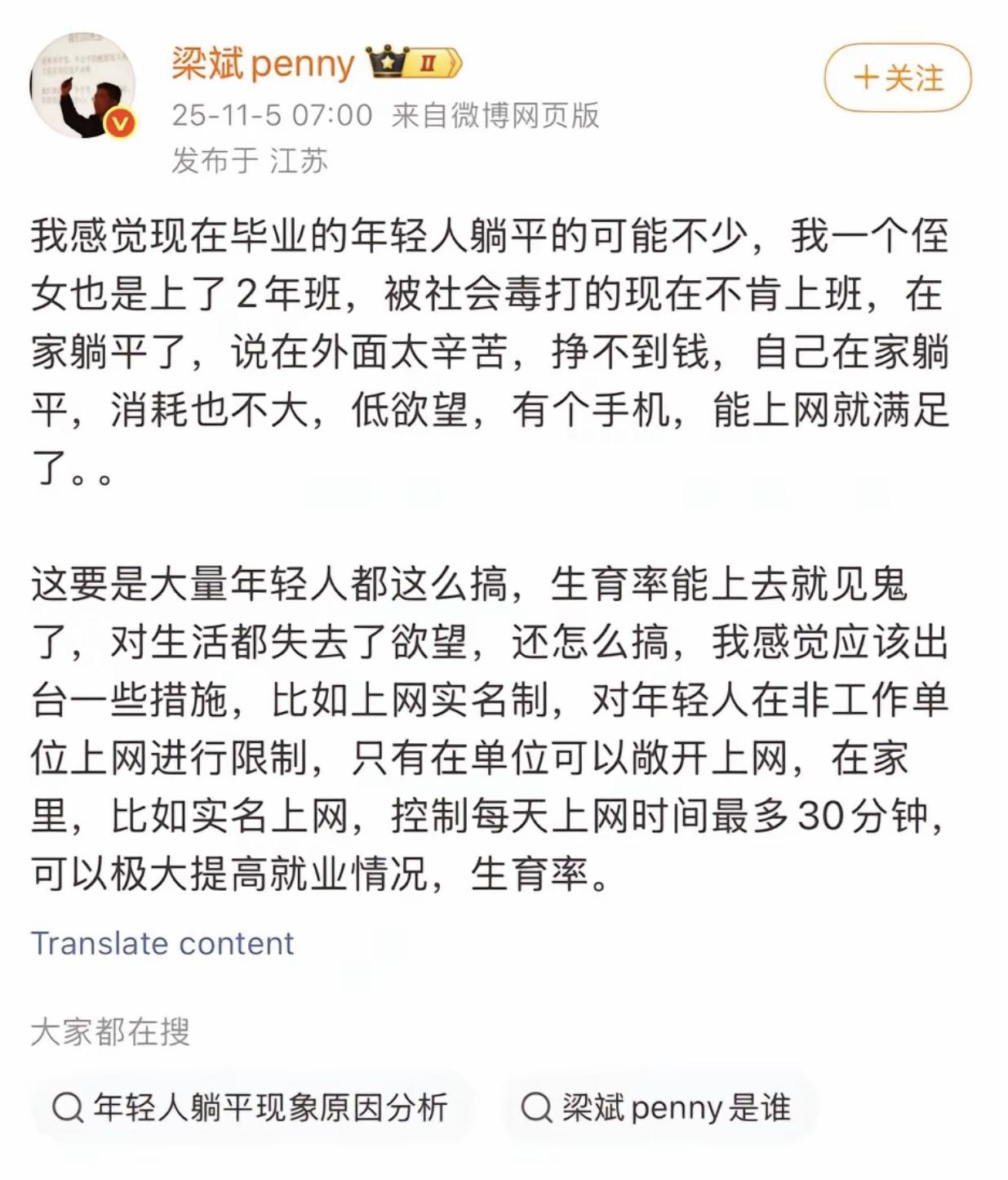 刷到一博主说他感觉现在毕业的年轻人很多人都喜欢躺平,他以自家的一个侄女为例,说她上了2年班,之后就不肯上班,在家躺平了,说在外面太辛苦,挣不到钱,自己在家躺平,消耗也不大,低欲望,有个手机,能上网就满足了。他表示这要是大量年轻人都这样对生活都失去了欲望就会影响生育率, 看前半段以为是理解我们,是想下雨了给我们一把伞,没想到往下看竟然是劝我下雨天跑快点[捂脸]他提议出台一些措施,比如上网实名制,对年轻人在非工作单位上网进行限制,只有在单位可以敞开上网,在家里,比如实名上网,控制每天上网时间最多30分钟。 真的笑了,不是他真以为大家躺平是因为沉迷网络[捂脸]不会以为上班有网就能吸引人吧,其实上班根本没有时间玩手机有没有网都一样[捂脸] 上班有机会赚到大钱,大家会在家躺着?在公司做牛做马,升职加薪轮不上,躺平就怪人家有年轻人沉迷网络?能好好过日子谁不想过好日子?