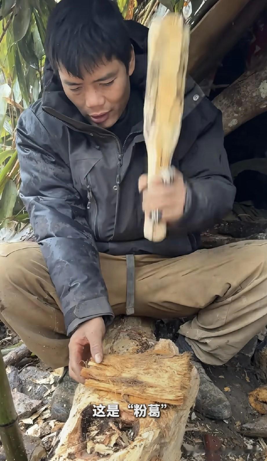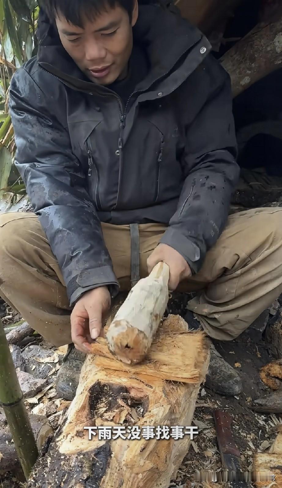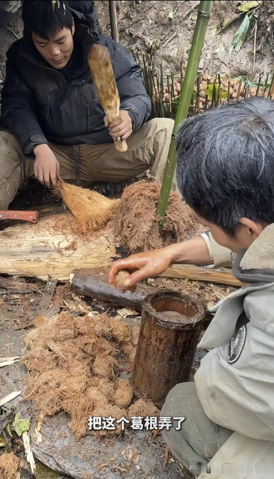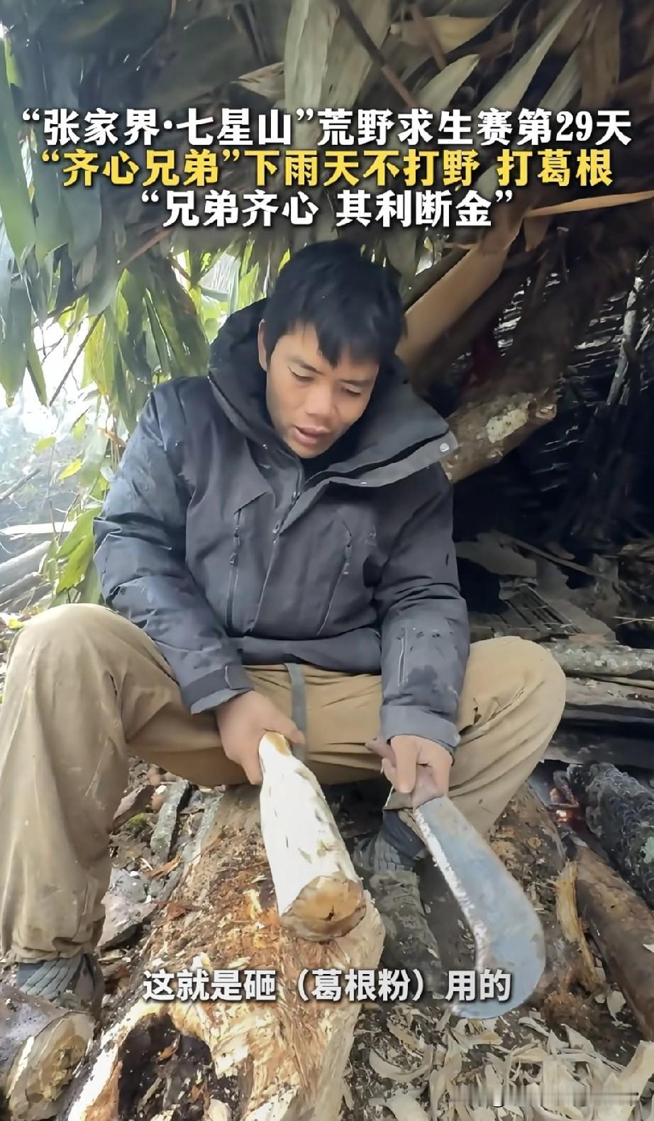 荒野求生这俩兄弟把“摸鱼”玩成了生存顶配 张家界七星山的野地里,“齐心兄弟”把下雨天过成了“农家乐”:不慌着找肉,蹲在棚子底下凿葛根,还要捣成葛根粉——这哪是求生,分明是来山里搞“土特产加工”的! 别人荒野里啃树皮填肚子,他俩拿着木槌捶葛根,连工具都自己动手做,弹幕笑疯:“这是来参赛还是来度假的?” 但你别说,这操作还真戳中不少人:求生不一定得苦哈哈,会就地取材搞“精细活”才是真本事。 可也有人怼:“比赛比的是生存效率,磨葛根粉这功夫早饿晕了”——你们觉得,这种“慢节奏求生”,到底是聪明还是瞎耽误功夫