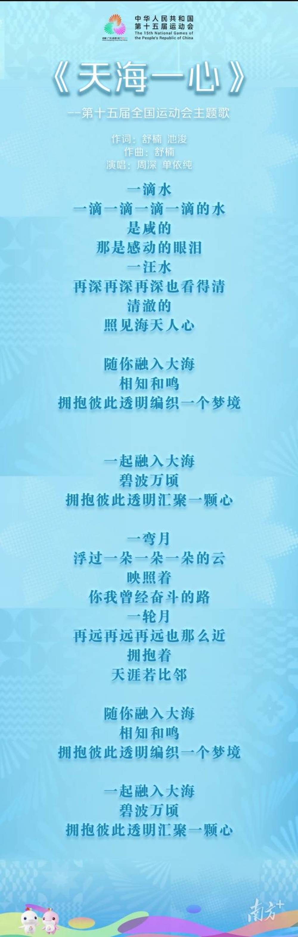 十五运会开幕式总导演郎昆介绍,《天海一心》由国家一级作曲、十五运会开幕式音乐总设计舒楠主导创作,将由周深和单依纯两位歌手在9日晚举行的十五运会开幕式上正式唱响。“当主火炬塔点燃,主题歌《天海一心》响起,天与海的设计理念将表现得淋漓尽致。”