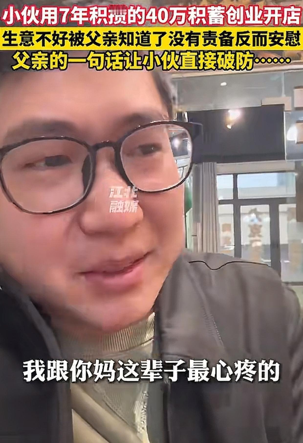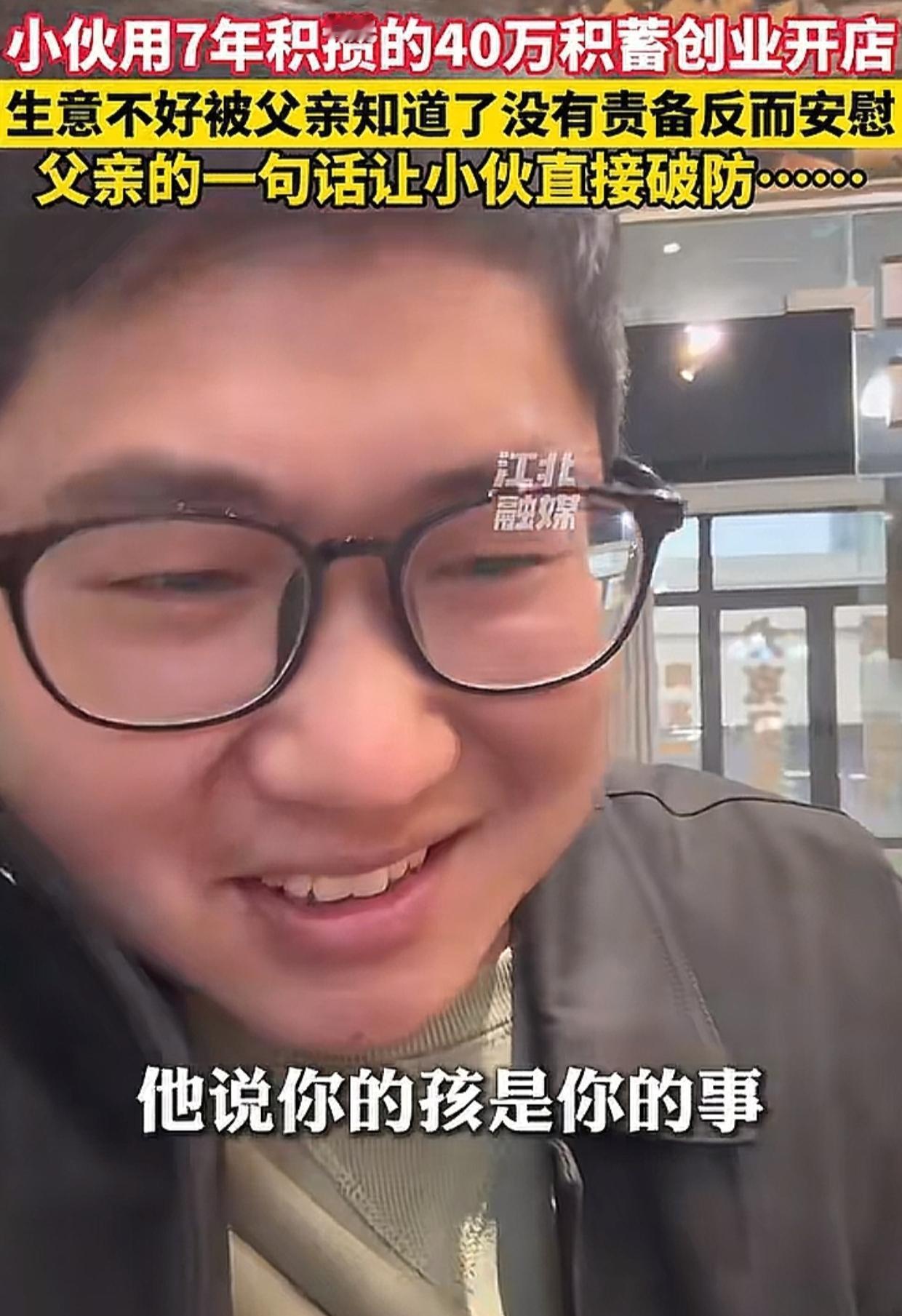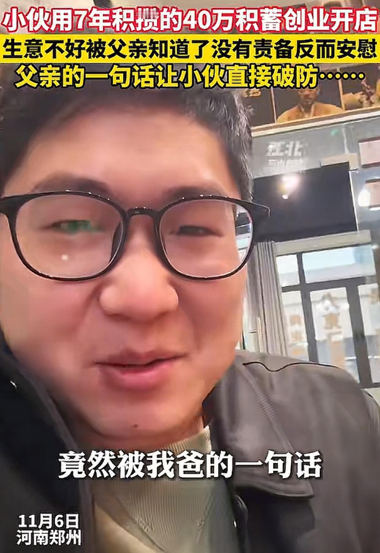 河南,男子用攒了7年的40万元开店,生意不好被父亲知道。父亲打电话没有责备,只有抚慰,还问:“缺钱吗?” 男子忙说没事儿,怕父亲担心,他接下来马上提起自己的儿子,想要转移话题,谁知父亲的一句话让他破防了! 父亲说:“你的孩子是你的事儿,我跟你妈这辈子最心疼的永远都是我们的儿子!” 男子听到这句话瞬间泪目,他表示,自从他的儿子出生后,全家都是围着小家伙转,都说隔辈儿亲,他以为父母心中的重心是孙子,没想到不是这样的。 男子红着眼圈说:“你们能懂吗,我30岁了能听到这样的话!” 看完视频,感觉男子真的好幸福! 父母对于孩子来说,最重要的意义不是提供舒适和富裕的生活,而是在心灵上成为孩子最温暖的依靠和最坚强的后盾。 男子的父母做到了,而且他们不像生活中很多父母那样羞于表达,而是非常勇敢地把对男子的爱和支持表达了出来。 相信这样的态度和话语不但抚慰了身处困境的男子,也给了他面对困难的很大勇气! 都说家永远是一个人心灵的港湾,男子的父母让我们更加明白了这句话的重要含义。难怪很多网友喊话,有这样的父母真的让人羡慕!