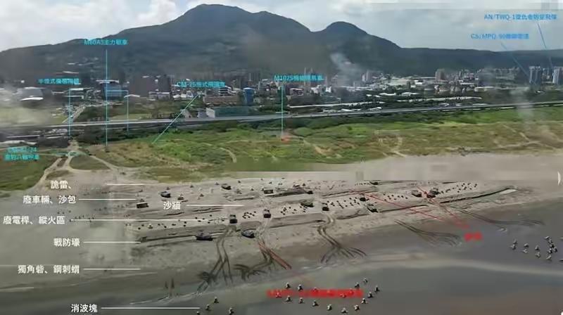 从水到岸,十层阻碍,远处高处是高架公路做台军的机动防御居高临下,我军车辆人员如何突破?