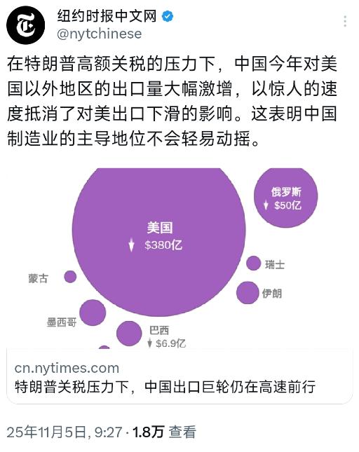 纽约时报中文网今天(11月5日)报道:“在特朗普高额关税的压力下,中国今年对美国以外地区的出口量大幅激增,以惊人的速度抵消了对美出口下滑的影响。这表明中国制造业的主导地位不会轻易动摇。” 看起来特朗普那波高额关税非但没把中国制造打趴下,反而让全球市场更清晰地看到了中国产业链的深厚底子。面对美国市场突然收紧的大门,中国企业没死磕,而是灵活调头,把货铺向了更广阔的地方。 结果对美出口确实是降了,可对世界其他地区的出口量嗖嗖往上涨,涨得还特别猛,愣是把对美下滑的那块给补上了还有富余。这手操作背后,是中国制造业那份“东方不亮西方亮”的底气,可不是随便哪个国家都能学来的。 这种出口方向的快速切换,可不是临时抱佛脚能成的。中国制造早就把摊子铺到了全球各个角落,特别是跟“一带一路”沿线那些兄弟国家,贸易纽带越扎越紧。 像东盟这样的邻居,已经成了咱们顶重要的贸易伙伴,前几个月双边贸易额涨幅都冲到了百分之十几甚至二十几。 这可不是简单地把原来运到美国的货转个方向就行,而是中国的工厂们能根据不同地方的口味和需求,快速调整生产啥、生产多少。这种适应能力,才是中国制造最难被替代的地方。 你可能会想,有些商品会不会玩个“曲线救国”,先运到越南、马来西亚这些地方转一圈,换了个标签再进美国?这种情况肯定有,但规模终究有限。 更关键的是,即便绕了路,很多美国进口商一算账,发现加上折腾的成本,中国货还是比别处买的划算。 这就没辙了,中国产业链的配套之全、生产效率之高、成本控制之狠,是几十年甚至更长时间积累下来的硬功夫,不是几道关税令就能轻易撼动的。 再说,中国自己家里的市场也大得惊人。不少外贸企业一看外头风浪大,立马把更多心思花在了内销上。 你还别说,国内消费者购买力一点也不弱,加上电商平台各种给力扶持,很多外贸货在国内同样卖得火爆,这就给了企业一个稳稳的“大后方”。 这种“外贸内需两条腿走路”的模式,让中国企业在面对国际市场波动时,腰杆子能硬得多,选择也多了不少。 当然啦,日子没那么轻松。全球南方市场虽然潜力巨大,但每个地方的规矩、习惯、基础设置都不一样,中国企业过去开拓,也得摸着石头过河,应付各种没见过的挑战。 但话说回来,中国商人的闯劲和韧性是出了名的,为了避开高关税,也为了长远发展,再难啃的市场也愿意去拼一把。像中东、俄罗斯、非洲这些地方,中国企业的身影现在是越来越活跃,带去的不仅是商品,还有技术、投资甚至是整套的生产线。这种更深度的捆绑,可不是一锤子买卖,它正在悄悄改变全球贸易的流向和格局。 所以你看,纽约时报的报道点出了一个关键事实:关税大棒没能轻易打断中国制造的筋骨。但这现象背后的逻辑更值得琢磨——它展现的是中国制造业全方位的韧性。 这韧性不光体现在能快速把货卖到别处,更体现在产业链的弹性、对内外两个市场的平衡能力,以及企业们那种“只要有机会就能钻进去”的开拓精神。 经过这么一折腾,世界反而更看清了,中国制造已经深深嵌进全球经济的方方面面。想绕开?谈何容易。 即便未来贸易摩擦的剧本还会翻新花样,但中国制造业凭借其庞大的体量、齐全的门类和不断提升的效能,它的主导地位在可预见的将来,依然会是很稳的。 接下来的看点,或许就是中国制造如何在这场“关税压力测试”中,一边稳住基本盘,一边加速向产业链更高端爬升,让自己变得更难被替代。