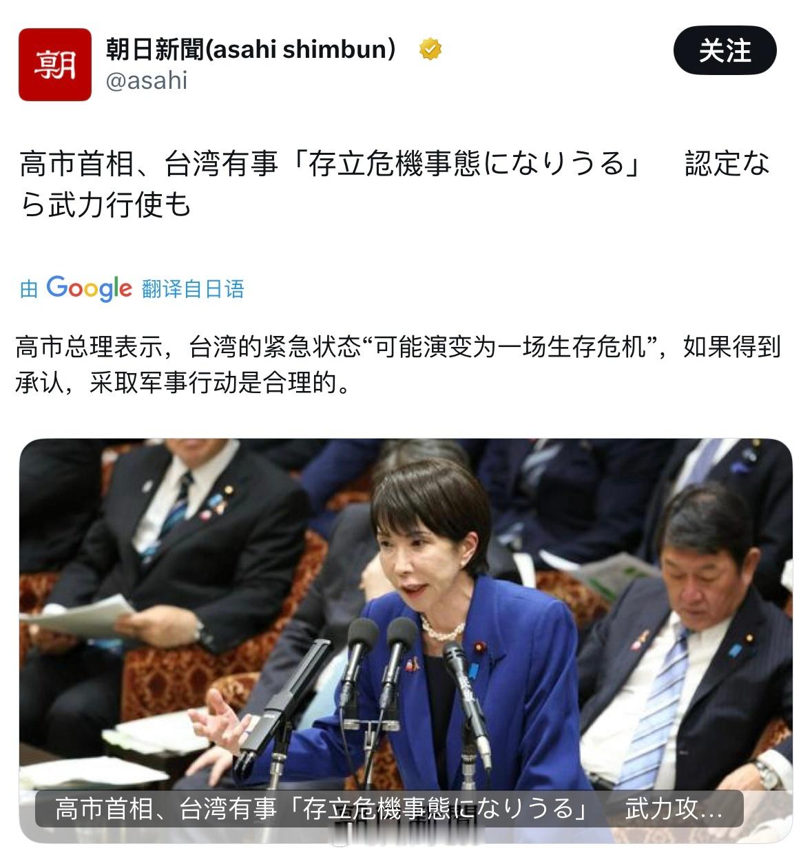 高市早苗:台湾有事,日本采取军事行动是合理的
