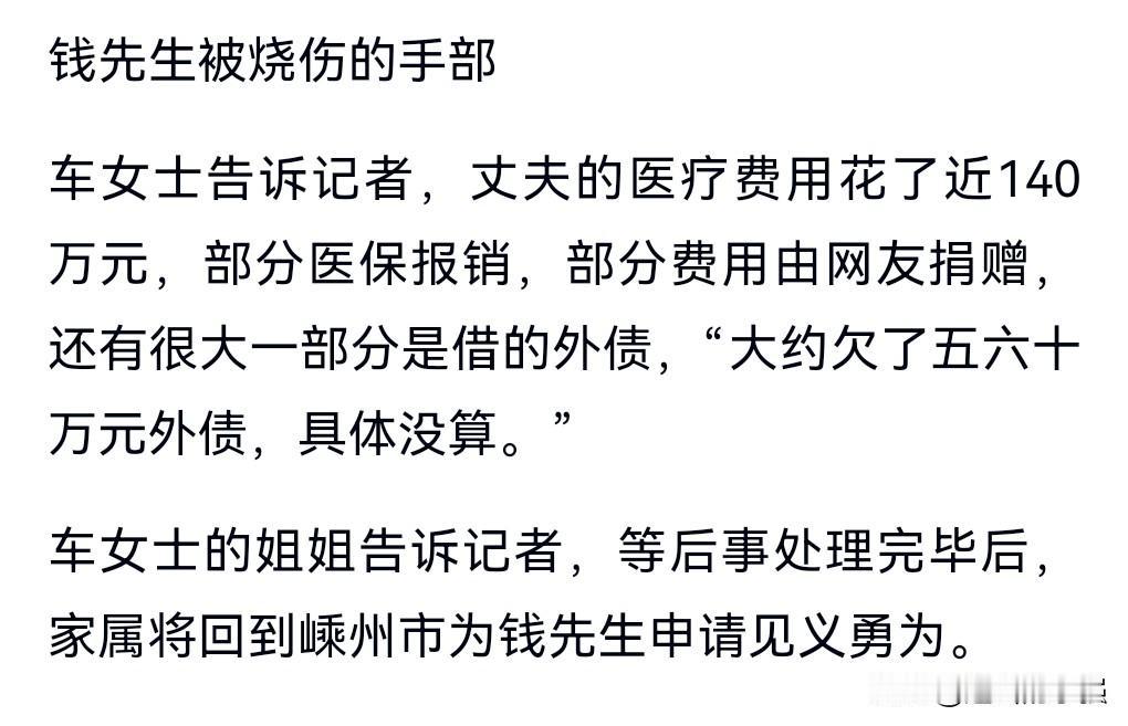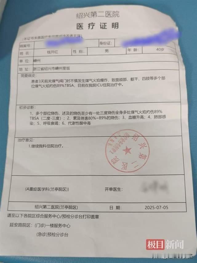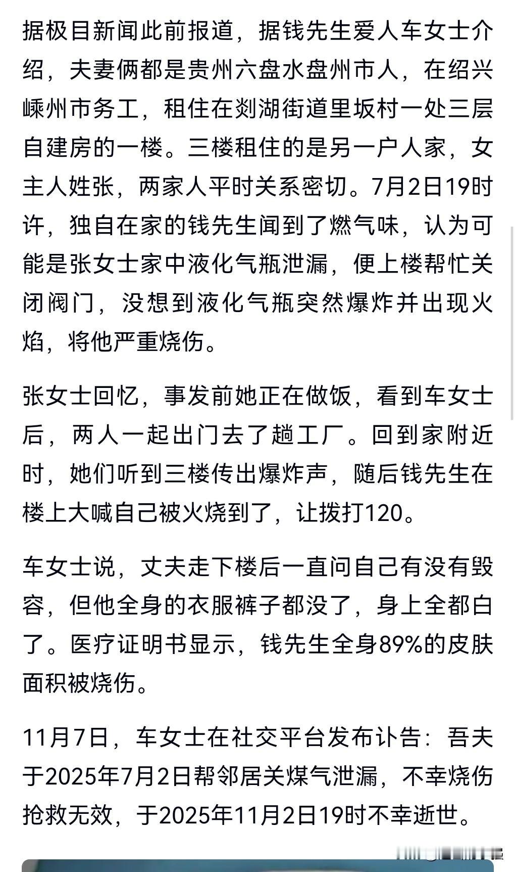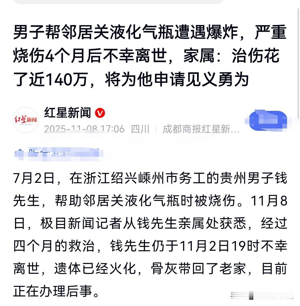 这也太倒霉了吧,男子帮邻居关液化气瓶遇爆炸去世。 事故发生在7月2日的浙江绍兴。 几个月后的11月2日19:00不幸离世。 已经火化了,骨灰已经带回老家。 液化气爆炸太可怕,当时男子全身都白了,身上的衣服都没了。 关键是被烧伤太费钱了,治疗花了近140万。 这真的是无力承担啊。 普通人真的是很难承受这样高额的治疗费。 医院能不能少收一点钱啊。