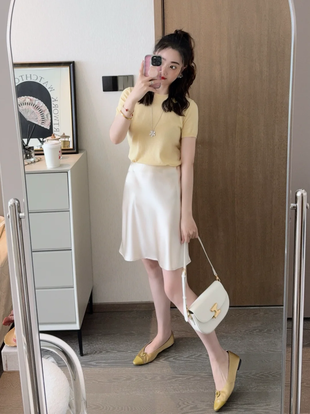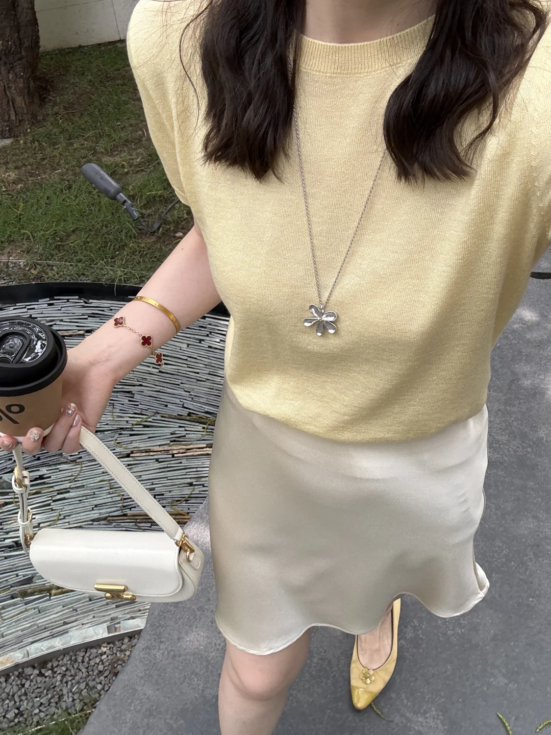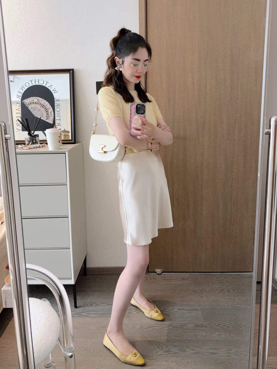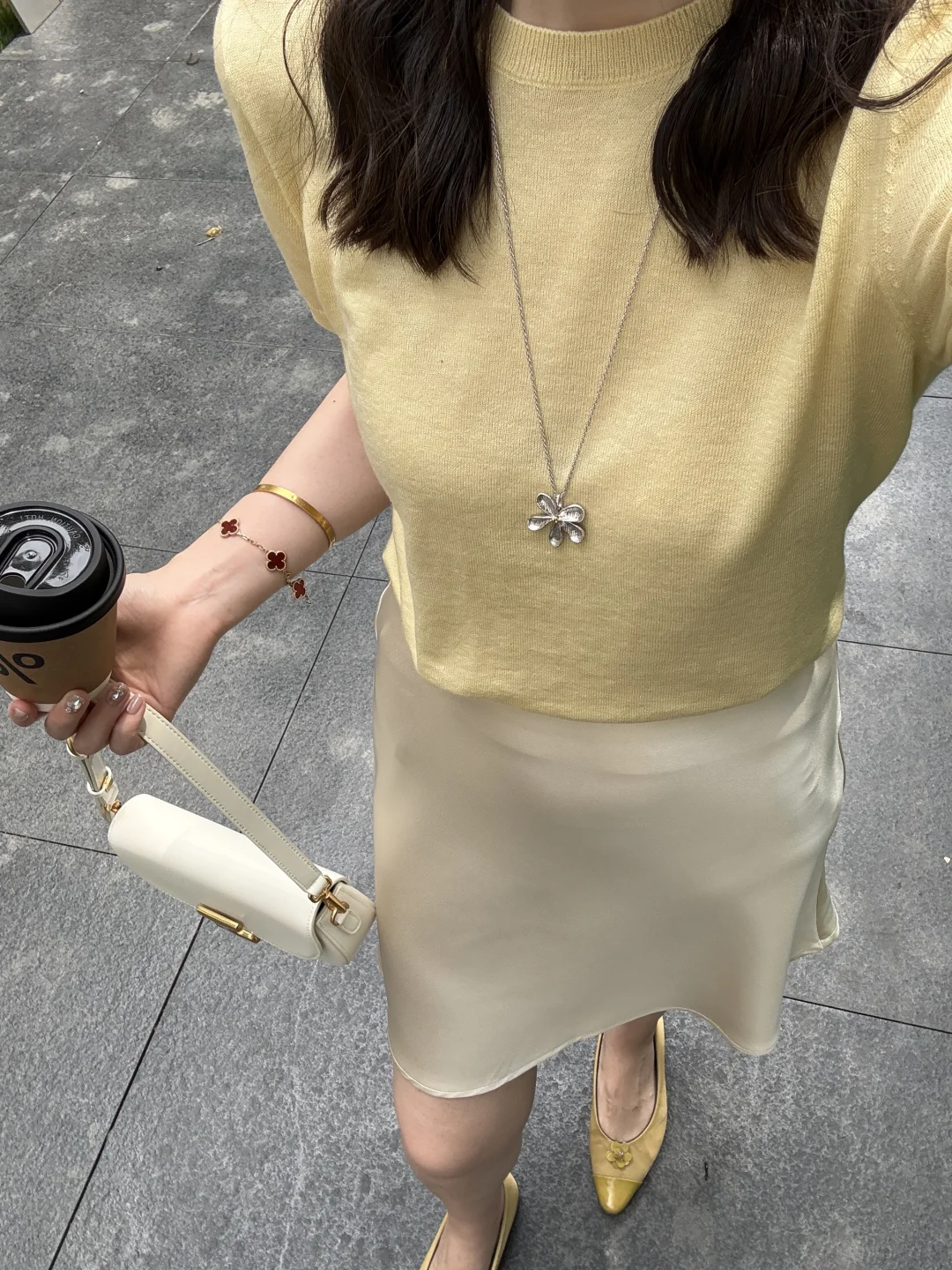 阴雨天的南京,真的很舒服~~ 🌧️🍌 今天的ootd有点喜欢💕 每年都会入这样的醋酸半裙,今年盲选了短款,竟然意外显瘦~ 随手配了个同色系的针织衫,一整个温柔住了~~~ 周四啦,忙碌起来的时候一周过得实在是快~~🍂