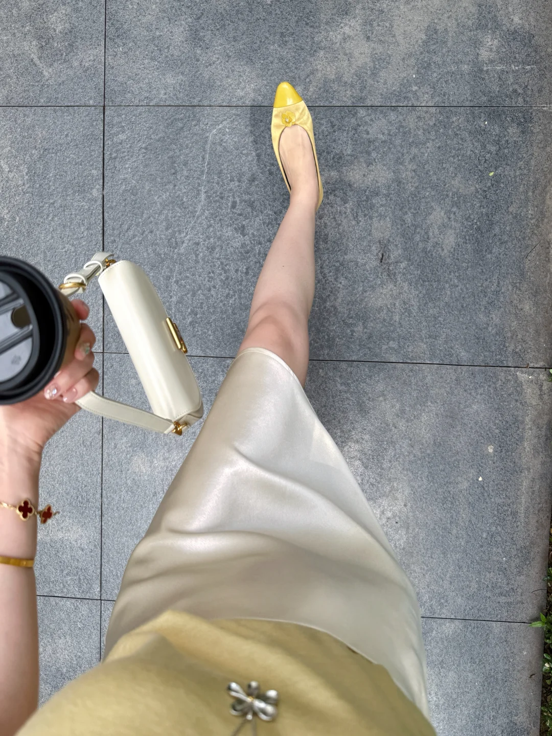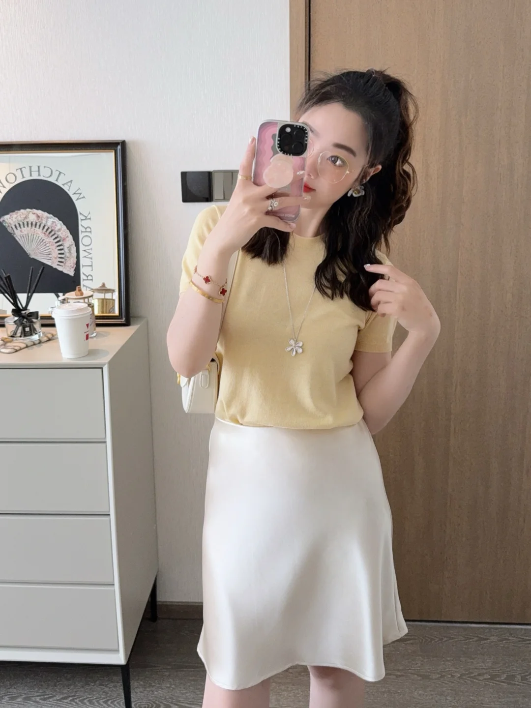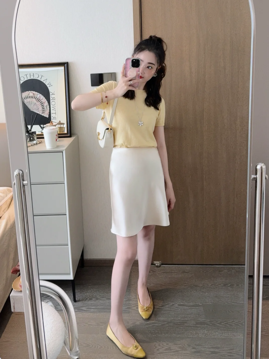 阴雨天的南京,真的很舒服~~ 🌧️🍌 今天的ootd有点喜欢💕 每年都会入这样的醋酸半裙,今年盲选了短款,竟然意外显瘦~ 随手配了个同色系的针织衫,一整个温柔住了~~~ 周四啦,忙碌起来的时候一周过得实在是快~~🍂