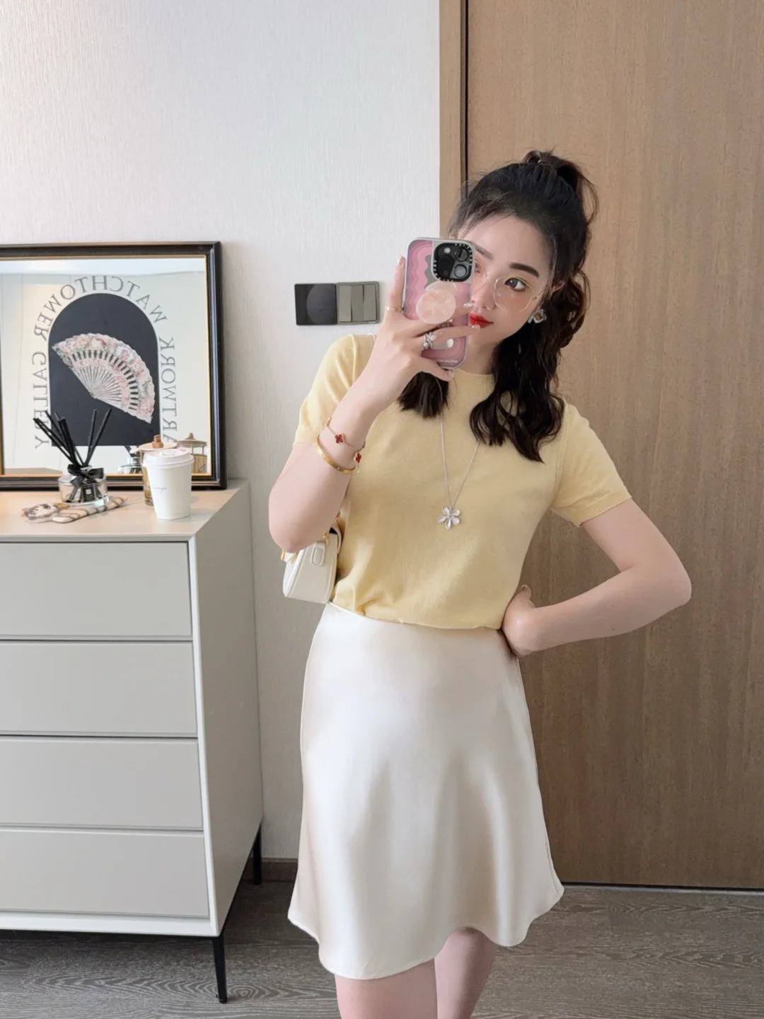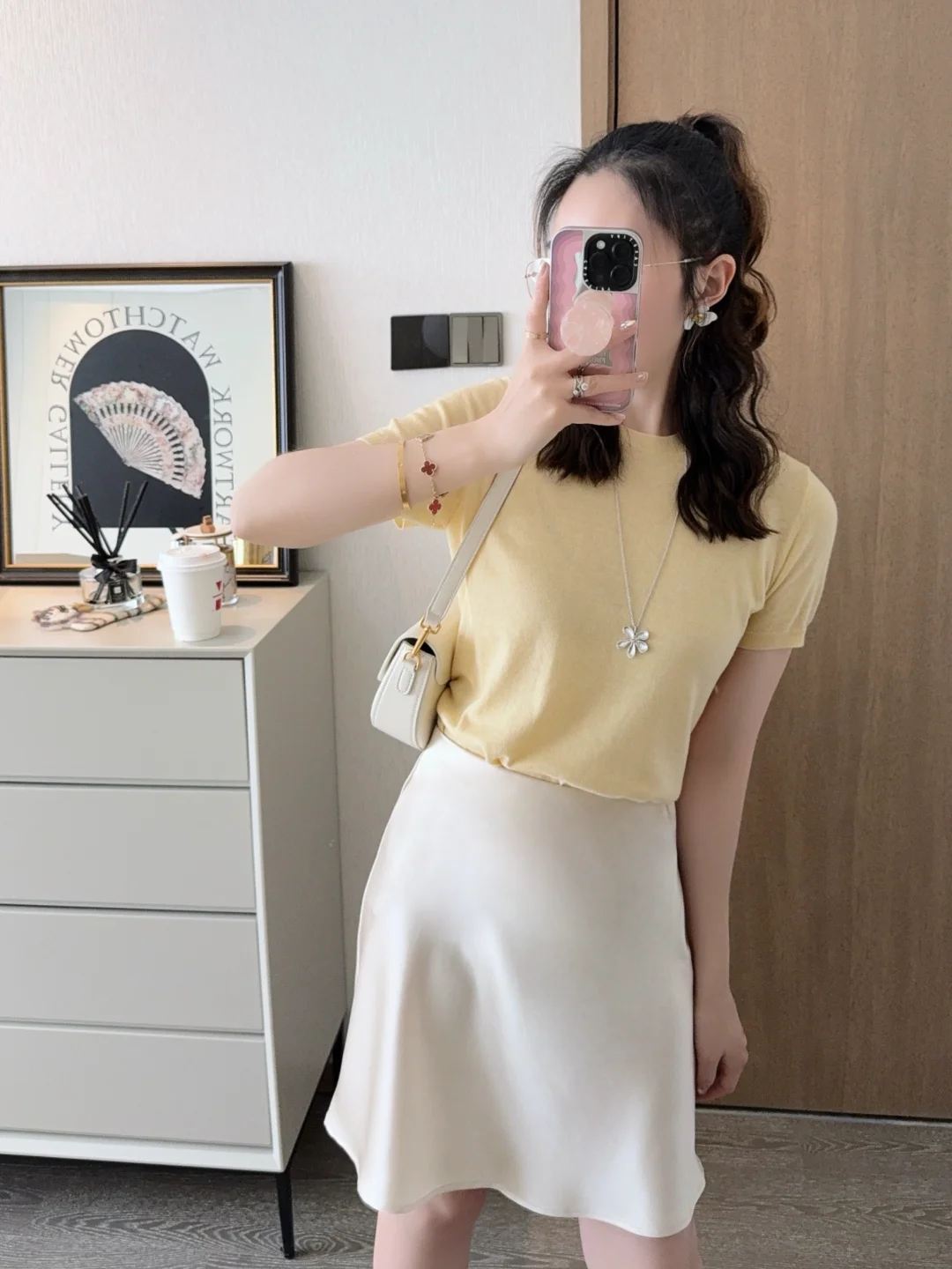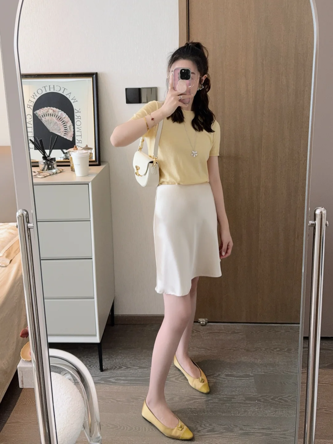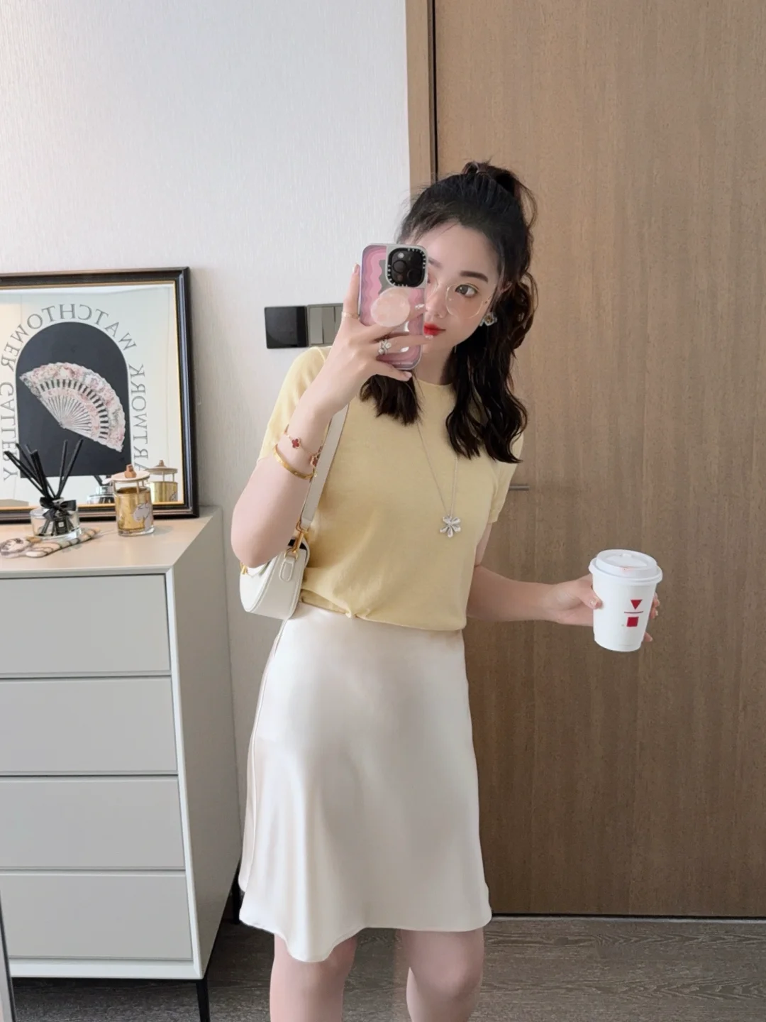 阴雨天的南京,真的很舒服~~ 🌧️🍌 今天的ootd有点喜欢💕 每年都会入这样的醋酸半裙,今年盲选了短款,竟然意外显瘦~ 随手配了个同色系的针织衫,一整个温柔住了~~~ 周四啦,忙碌起来的时候一周过得实在是快~~🍂