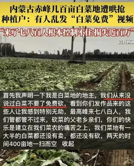 白菜免费?别让贪小便宜的心,砸了菜农一年的饭碗! 这两天,内蒙古赤峰菜农李先生的400亩白菜地,被七八百人哄抢一空。起因竟是一条网友瞎传的免费砍白菜视频,更离谱的是,当地官媒《红山晚报》竟不加核实直接转发,还给视频配文收获满满,非常开心。 菜农嗓子喊哑了也没人听,只能眼睁睁看着收成被塞进麻袋,拉上货车。有人甚至理直气壮!媒体都报了,还能有假?闹剧背后,是造谣的嘴,失信的媒,哄抢的腿,三方联手碾碎了一个家庭的希望。 官媒带头传谣,公信力比白菜还不值钱!那些开车几十公里抢几棵白菜,油费都不够,图啥?不是蠢就是坏,谁家种几百亩菜白送? 类似事件不是第一回了!抢玉米,抢红薯,抢药材……每次都以法不责众收场。但这次不一样,菜农已聘请律师,法律可能让哄抢者明白。免费的代价,或许是罚款,拘留甚至刑责。