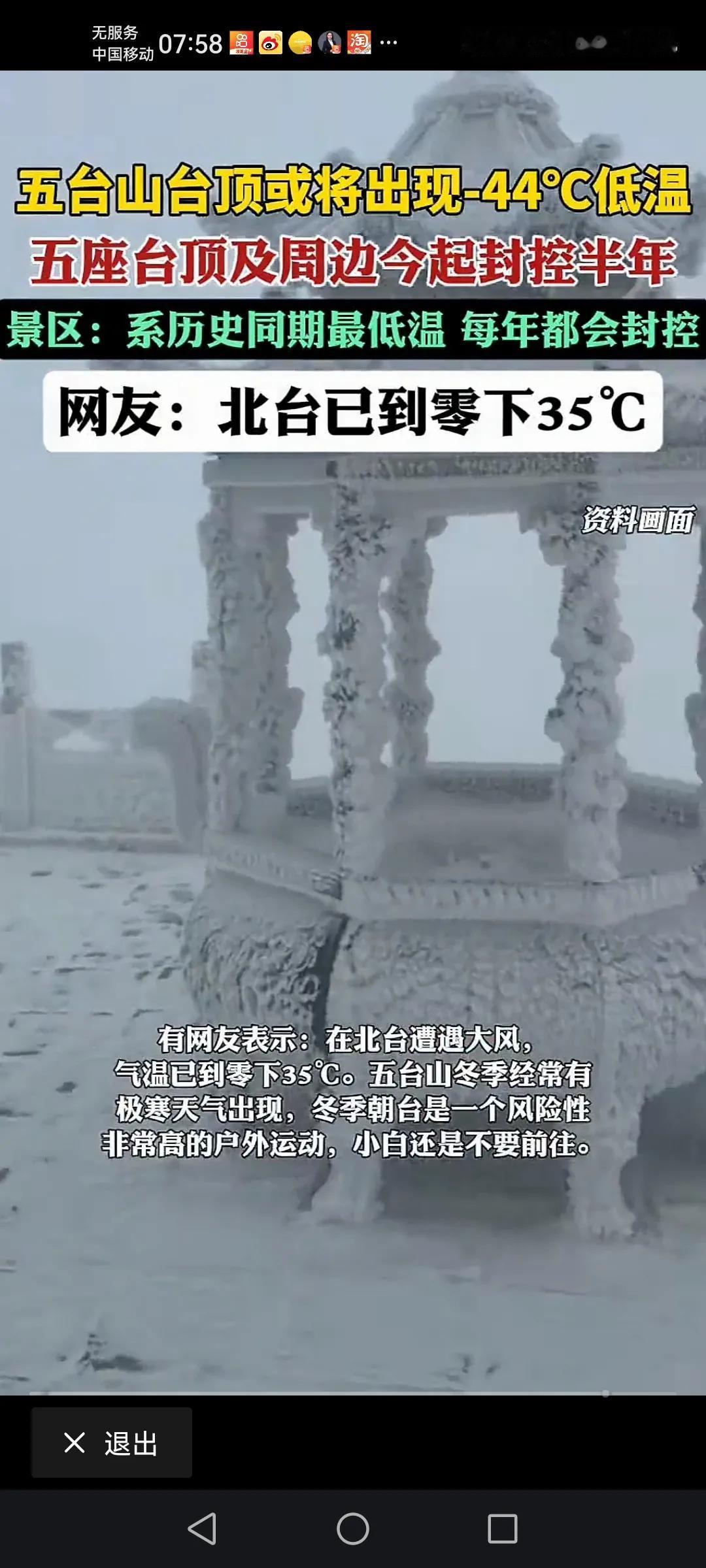 山西忻州境内的五台山顶现在也是大雪纷飞了啊! 这山顶有5座山,从空中俯看就像一朵巨大的莲花,你说这五台山海拔也不是很高,现在就降温了,低至零下35度,最低可达零下四十多度,五台山可是山西名山,中国名山呢,也是国家五A级景区。 到时候封的话半年,主要原因还是纬度问题吧!咱们云南丽江玉龙雪山这么高,一年也没有封多久,加起来一个月不到,山西五台山要封半年,海拔比玉龙雪山低多了,这也应该是五A级旅游景区封得时间最长的景区之一了吧!以上仅供参考,属个人意见!