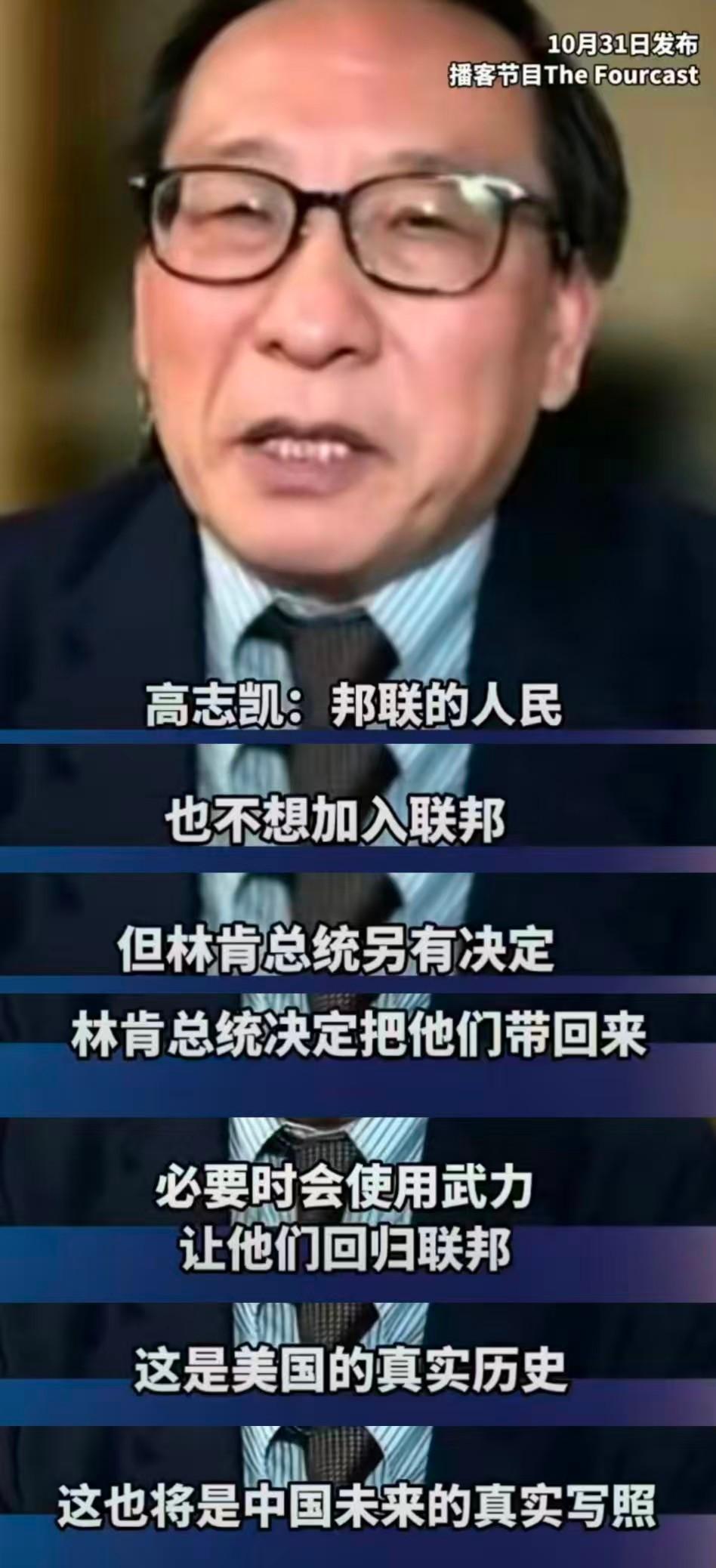 高志凯引经据典,又把美国“台独”主持人给怼了:林肯当初不也武力统一了?   2025年11月初,这位苏州大学讲席教授、全球化智库副主任,在一档美国播客节目上,面对“台湾不愿统一”的老调,冷不丁就甩出一句:“林肯当年不也武力统一了?”   这话一出,现场气氛瞬间凝固,主持人原本洋洋洒洒的“民主说教”突然卡了壳,脸上的神情比断线的网络还尴尬。   这可不是一句情绪化的反击,而是精准打击了美国对中国统一问题的双重标准。   高志凯没有虚张声势,也不靠喊口号,他干干净净地扒下了美国那层“人权外衣”下的现实逻辑:国家主权和领土完整从来不是请客吃饭,是底线中的底线。   1861年,美国南方七州以“州权”为名脱离联邦,林肯政府立刻出兵,打了整整四年,一场内战死了三十多万人。   结果呢?林肯今天还在华盛顿纪念堂高坐神坛,被美国人奉为“伟大的统一者”。   那时候美国没说“尊重民意”、没喊“和平分手”,有的只是“联邦不可分裂”。高志凯就问了:美国有权统一,凭什么中国没有?   主持人当场愣住,试图转向所谓“台湾民意”。   高志凯反手又是一记重锤:你们天天说台湾人不愿统一,可台湾是你们的吗?你们是谁,能替台湾说话?   从《开罗宣言》《波茨坦公告》到1971年联合国第2758号决议,国际法的字字句句都摆在那里:台湾属于中国。   美国人不是没签字,也不是不知道,只是现在不愿承认。   1979年中美建交时,美国亲口承认“一个中国”,如今却在对台军售、议员窜访、军事勾连上花样百出,搞“战略模糊”成了战略背叛。   高志凯说得直白:美国不是不懂历史,而是选择性失忆。他们最擅长的,不是解释事实,而是制造叙事。   把曾经用于捍卫自身统一的逻辑,拿来否定别人的统一权利,这种嘴脸不只是伪善,更是危险。   因为它不仅误导美国民众,也在台海制造误判。   就在不久前的全国台研会年会上,多名专家指出,美国仍在以“榨台遏华”为核心操作台湾问题。   一边打“民主”牌,一边掏空“一个中国”,背后目的很清楚,不是关心台湾,而是要把台湾变成牵制中国的工具。   高志凯当场指出,这种策略早就被识破了。   更让人拍案叫绝的是,高志凯并没有停留在历史批判上,而是将话题拉回当下。   他指出,中国统一的路径是清晰的,和平优先,必要时不排除使用手段。   这不是威胁,而是态度。和美国当年打内战的出发点一模一样:国家统一,不容挑战。   这番话在进博会期间引发了不小的反响。   2025年11月5日至10日,第八届进博会在上海举行,高志凯出席期间再次强调,“国家统一”与“经济开放”并不冲突,反而是相辅相成的。   如果一个国家连基本主权都无法完整,何谈市场稳定与全球合作?   而美国现在一边高喊自由贸易,一边在台湾问题上点火添油,这种操作逻辑早晚会反噬自身。   高志凯建议,中美应该做“加法”而非“减法”。   要谈贸易,就真诚谈;要管分歧,就别踩底线。   否则再多的“对话机制”,也只是“说一套做一套”的表演。   他还提议推动人民币结算,尤其是在大宗商品领域,如挪威三文鱼这样的贸易品种,人民币结算比例应从3%提升至30%。   这不仅是经济建议,更是一种战略姿态。   而在台湾民意的问题上,高志凯也没有放过。   他指出,所谓“台湾不愿统一”是伪命题。   2025年台湾“罢免潮”之后,民进党的“倚美谋独”路线遭遇极大挫折,岛内越来越多民众开始意识到:和平发展才是正道,经济融合才有未来。   不再被民进党操控话语权的台湾社会,正在用实际行动表达真实选择。   而此时美国仍在炒作“台湾民意”,不过是想用“民主包装纸”包住分裂泥沙。   高志凯正面指出:真正的民主,是尊重历史、尊重法理、尊重大多数人民的根本利益,而不是拿几个民调当挡箭牌。   这场节目播出后,引发海内外舆论热议。   许多网友感叹:终于有人把美国的内战逻辑搬上台面,让他们自己看看当年的自己。   有人干脆说:“林肯地下有知,恐怕也会气得爬出来。”   其实,这不只是一次语言交锋,更是一次历史镜像的照见。   美国内战的逻辑很清楚:国家不能分裂,统一是底线,牺牲是代价,正义是旗帜。   而现在,中国面对的,是同样的挑战,却遭到同样的人以相反的态度指手画脚。这种历史的对称性,不容否认,也不容歪曲。   高志凯指出,中国当前的政策路径是“和平统一、一国两制”,但同时要有准备,面对“台独”分裂势力与外部干预,必须保留一切必要手段。   这是国家的权利,也是民族的责任。美国可以容不得南方脱联邦,中国就不能容忍台独毁中华。   美国人曾为自己的统一流血牺牲,如今却试图用干预他国统一的方式证明“民主”,这不是矛盾,而是讽刺。   而这场讽刺,今天在一个中国学者的语言里,被原样奉还。