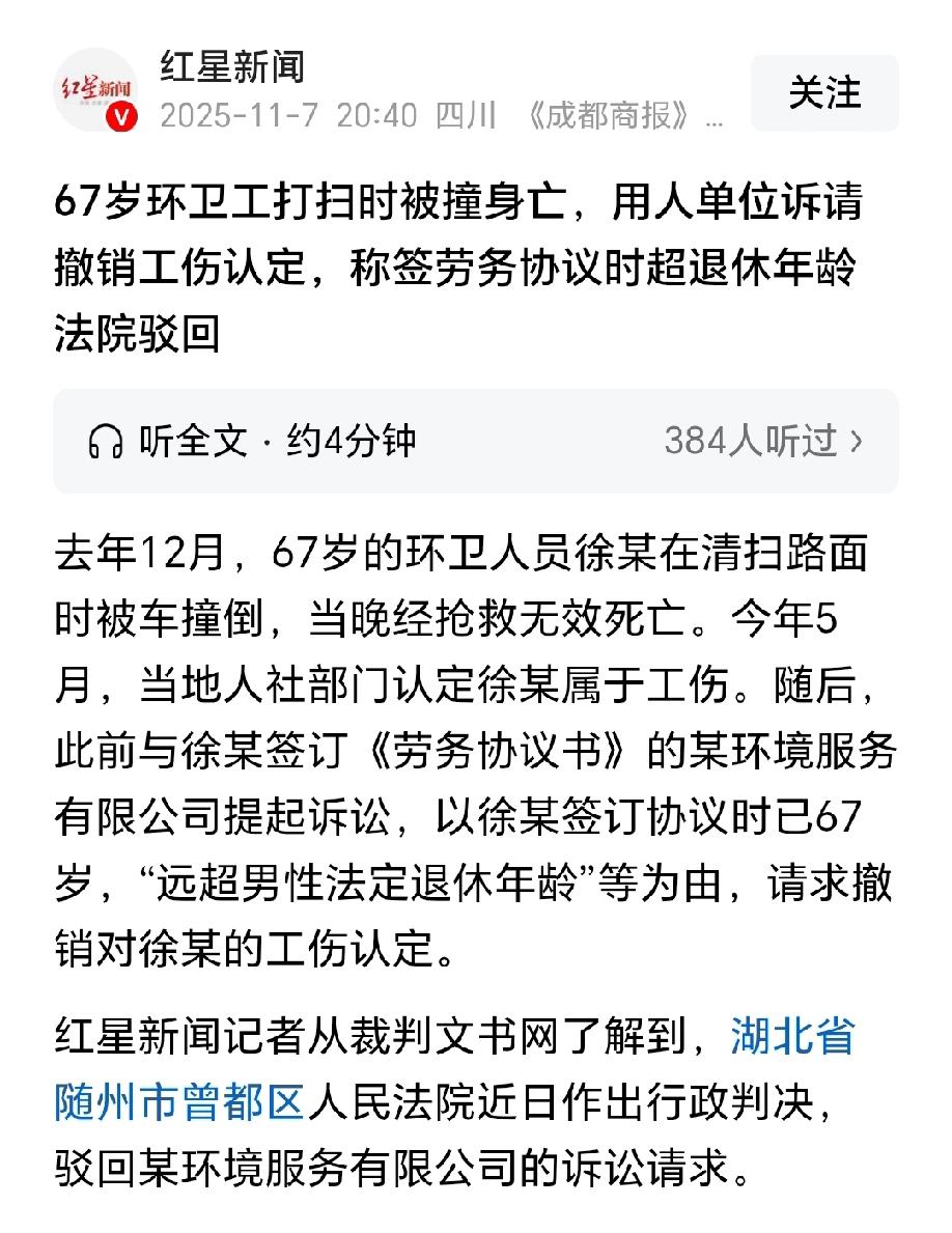 湖北随州,67岁的环卫工人在打扫马路时,被一辆疾驰的小轿车撞倒身亡,值得安慰的是,人社部门对其作出工伤认定,但他所在的公司却不认可。公司认为,他们和男子签订的是劳务协议,而且男子远超法定退休年龄,并不具备劳动关系主体,请求法院撤销工伤认定。法院审理后,作出这样的判决。 据报道,2024年12月的一个傍晚,67岁的徐某穿着橙黄色环卫服,正拿着扫帚仔细清扫路面。 天刚擦黑,路灯还没完全亮起,他想着赶紧把负责的路段扫干净,就能按时下班回家,可没曾想,一辆疾驰的小轿车没注意到正在作业的徐某,径直撞了上去。 周围路过的市民赶紧上前帮忙,紧急拨打了120和122。 救护车呼啸而至,将重伤的徐某送往医院抢救,可即便医生拼尽全力,当晚10点半,徐某还是因伤势过重,永远地离开了人世。 消息传到徐某家里,家人更是悲痛欲绝,早知如此,当初就不该让他找这份工作。 徐某辛苦了一辈子,退休后还闲不住,非要找份活干,想着能补贴家用,让子女们能轻松点。 2024年8月,徐某通过招聘进了当地一家环境服务有限公司,双方签了《劳务协议书》,约定工作期限到2025年8月,每天分两段时间上班:早上9点半到13点半,下午5点半到晚上9点半。 这段时间里,老徐每天都按时到岗,从不偷懒,没想到竟然出了这样的意外。 处理完后事,家人想到徐某是在工作时出的事,便向当地人社部门申请了工伤认定。 今年5月,人社局经过调查核实,认为徐某是在工作时间、工作场所内,因工作原因受到事故伤害。 依据《工伤保险条例》第十四条规定,职工有下列情形之一的,应当认定为工伤 :(一)在工作时间和工作场所内,因工作原因受到事故伤害的。 人社局认定徐某的遭遇符合《工伤保险条例》的规定,因此作出工伤认定。 本以为这是对徐某最大的安慰,可谁知,这份工伤认定却遭到了徐某所在公司的拒绝。 公司表示,他们和徐某签的是《劳务协议书》,并不是劳动合同,而且徐某签协议时已经67岁,远远超过男性的法定退休年龄,根本不具备建立劳动关系的主体资格。 因此,公司认为徐某这种情况不能认定工伤,还一纸诉状把人社部门告上了法院,请求撤销工伤认定。 公司在法庭上辩称,协议里明确约定双方不构成劳动关系,而且徐某也不符合劳动关系的适格主体,不能适用《工伤保险条例》。 对此,法院会如何审理呢? 首先,是否构成劳动关系是工伤认定的核心前提,也是案件争议的焦点。 《工伤保险条例》第十八条明确规定:提出工伤认定申请应当提交下列材料:(二)与用人单位存在劳动关系的证明材料。 公司以签订的是劳务协议为由否认工伤,实则混淆了协议名称与法律关系实质。 法院审理查明,徐某需严格遵守公司规定的上下班时间,从事的环卫清扫工作是公司核心业务组成部分,且公司按月支付劳动报酬,这些特征完全符合事实劳动关系的认定标准。 徐某和公司已经形成事实劳动关系,即便未签订劳动合同,只要存在实质用工关系,就满足工伤认定的前提条件。 其次,超龄务工农民的工伤权益受法律特殊保护。 最高人民法院行政审判庭关于超过法定退休年龄的进城务工农民因工伤亡的,应否适用《工伤保险条例》请示的答复规定:用人单位聘用的超过法定退休年龄的务工农民,在工作时间内、因工作原因伤亡的,应当适用《工伤保险条例》的有关规定进行工伤认定。 公司以徐某67岁远超男性法定退休年龄、不具备劳动关系主体资格为由拒绝工伤认定,但其忽略了徐某进城务工农民的特殊身份。 法院认为,徐某属于进城务工农民,双方实际上已经形成了劳动关系,并非公司声称的劳务关系,这种情况应当适用《工伤保险条例》进行工伤认定。 最终,法院作出判决,驳回了公司的诉讼请求,维持了人社局工伤认定的决定。 身上若无千斤担,谁愿拿命赌明天。如果没有经济压力,谁又愿意60岁以后还去打工赚钱,徐某难道不知道在家躺着安享晚年吗? 法院这样的判决可谓大快人心,不仅给了徐某家人公道,更守住了超龄务工者的权益底线,给了徐某最后的慰藉。