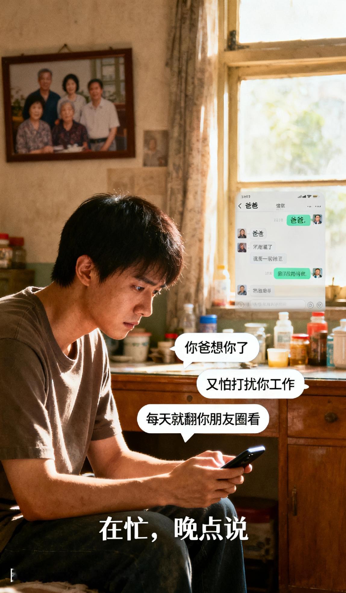 我妈偷偷跟我说:“你爸想你了,又怕打扰你工作,每天就翻你朋友圈看。” 我鼻子一酸,翻开和爸爸的聊天记录,最后一条是我三天前回的:“在忙,晚点说。”那个“晚点”再也没来过。 我们总对最亲的人,最没耐心。对客户的消息秒回,对领导的要求言听计从,却把最敷衍的态度留给了身后的父母。爸爸的朋友圈点赞永远准时,可我发的十条动态里,九条没给他回应;他小心翼翼发来的养生文章,我随手划过说“没意义”;他想视频聊聊家常,我总以“开会”“加班”匆匆挂断,殊不知电话那头的他,可能对着黑屏的手机愣神许久。 长大后才懂,父爱从来都藏在沉默里。小时候他是无所不能的超人,会修玩具、会扛行李,会在暴雨天撑着伞在校门口等我;可如今他老了,连表达思念都变得小心翼翼。他不会像妈妈那样直接说“想你了”,只能通过翻朋友圈拼凑我的生活:看到我发加班的动态,会默默担心我没吃饭;看到我晒旅行的照片,会悄悄记下那个城市的天气;甚至连我随手发的一句吐槽,他都要琢磨半天是不是受了委屈。 我们总以为父母永远在原地等我们,却忘了他们也在悄悄老去。就像那位78岁的阿姨,女儿远嫁后,只能把思念藏在60秒缩成的文字里,把关心埋在凌晨的朋友圈点赞中。我们随口说的“下次回家”,在他们眼里是翘首以盼的约定;我们敷衍回应的“别操心”,在他们心里是渐行渐远的信号。那些被我们忽略的细节里,全是他们不敢言说的牵挂。 其实父母要的从来不多,不是多么丰厚的物质,也不是多么盛大的陪伴,只是一句耐心的倾听,一个及时的回应,一次不被打断的聊天。他们怕的不是孤独,而是自己的思念变成了打扰,怕自己的关心成了子女的负担。 我们总在忙着追赶世界,却忘了回头看看那个一直追赶我们的人。爸爸的朋友圈翻了一遍又一遍,等的不过是一句主动的问候;聊天记录里的“晚点说”,他一等就是好几天。 别让“忙”成为斩断牵挂的刀,别让“下次”变成永远的遗憾。今晚,就给爸爸打个电话吧,不用找复杂的话题,哪怕只是说一句“爸,我挺好的,你和妈注意身体”,就足以温暖他的整个晚年。 你多久没和爸爸好好聊过天了?评论区说说你和爸爸的故事,让我们一起把迟到的关心,补给那个最爱我们的人~