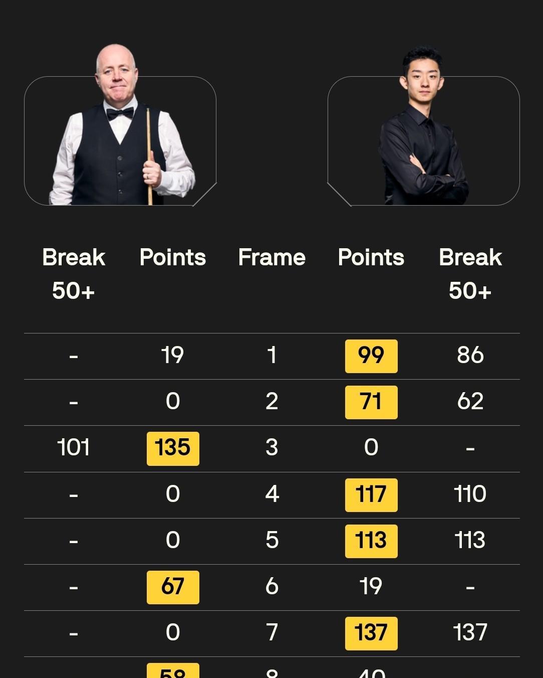 决赛上半场吴宜泽5:4领先希金斯。吴打出了3杆破百2杆50+,巫师真的是用自己的经验硬抗着对方的强大火力。 两人一个靠强大的猛攻,一个靠顽强的防守反击来拖住对方。比赛相当精彩激烈,只是现场观众的素质还是有待提高,几次希金斯准备击球时都受到大声的干扰,这样即便咱们最后赢了也不会觉得很光彩,希望下半场能回归一个干净的比赛氛围。