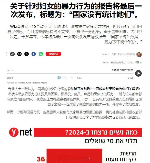 “妇女国际犹太复国主义组织”宣布最后一次发布以色列的家暴问题报告,因为以色列政府已经不关注、不统计妇女受到家暴侵害的问题了,相关政府部门也越发不愿意给他们提供数据,因此无法继续制作报告。