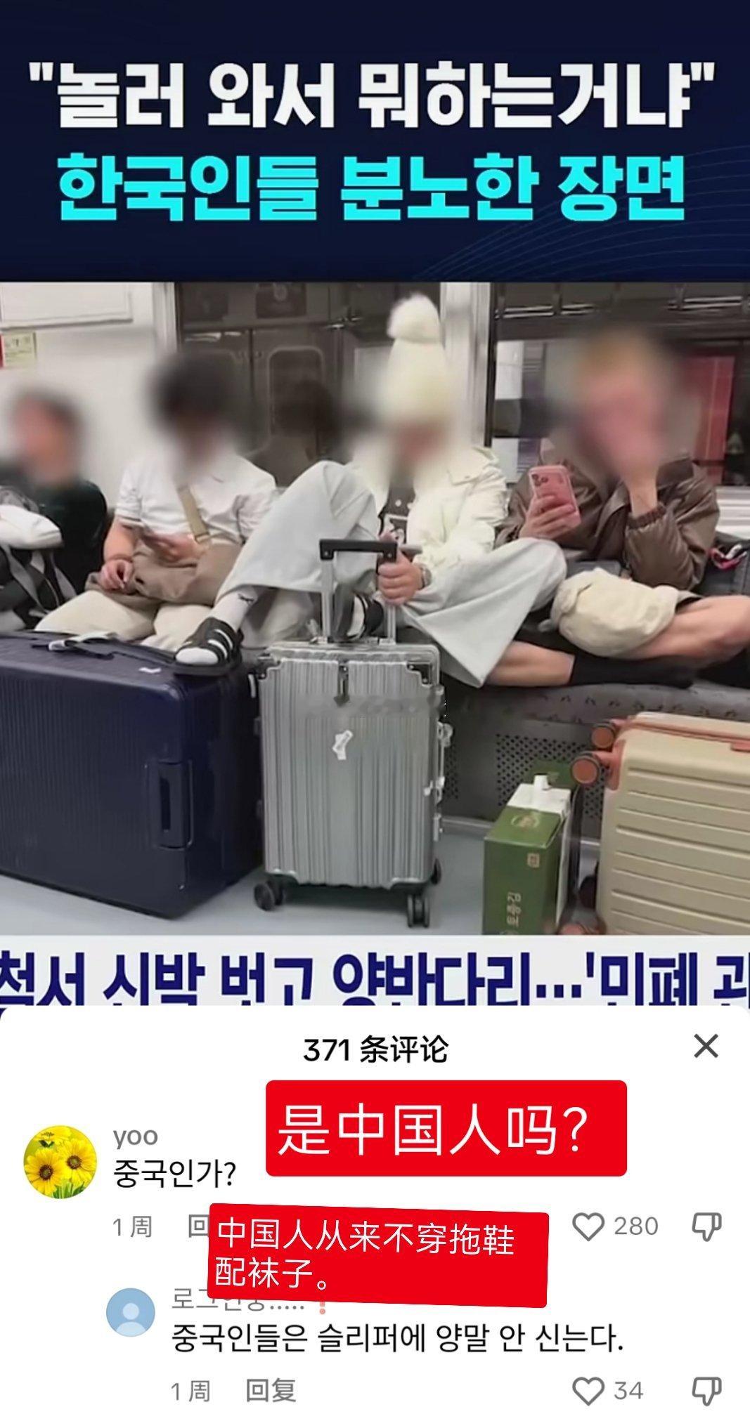 韩国媒体整天曝光地铁上有女子吃泡菜,有乘客把脚踩在行李箱上,韩国网民凡是遇上这种事一律都推给中国游客。