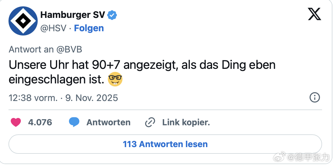 不知道是不是多特蒙德此举激励了汉堡,最终主队在补时第7分钟完成绝平,让多特蒙德到手的三分丢走。赛后汉堡俱乐部不忘发推表示,计时钟显示的是进球时间90+7分钟[挤眼]