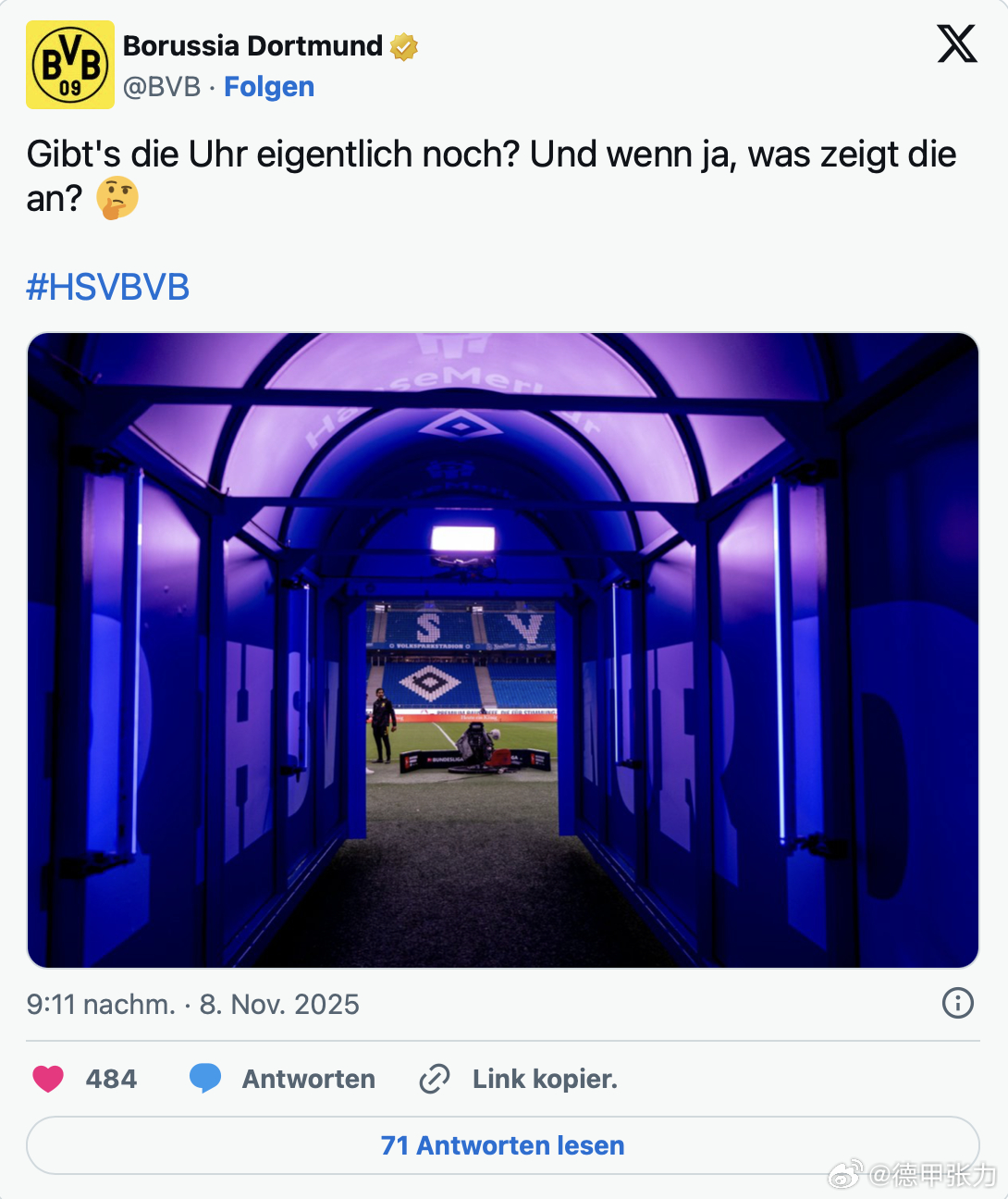 多特蒙德推特账号赛前一小时笑话汉堡,问主场计时钟去哪儿了,如果还在的话会怎么显示