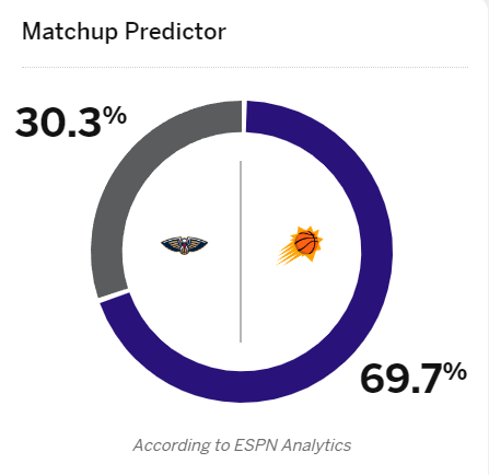 赛前,美媒ESPN预测本场比赛,太阳胜率69.7%占据上风,鹈鹕胜率为30.3%。
