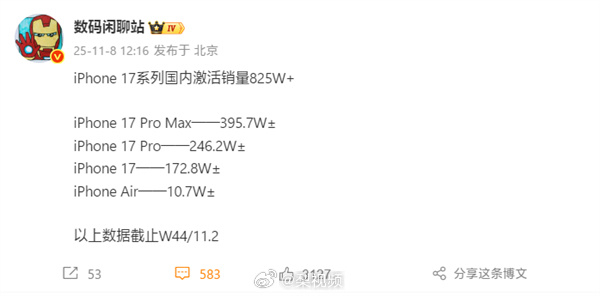 iPhone17系列国内激活销量 刚好逢双十一,苹果的销量和激活量肯定是涨的。我以为今年标准版提升这么大,销量应该更好。没想到上pro的还是一如既往的多[柯基]