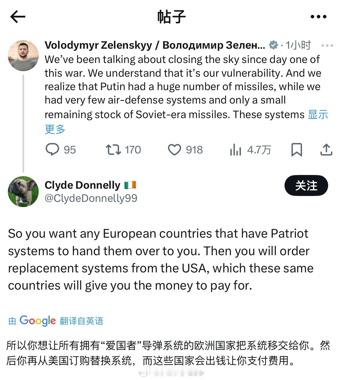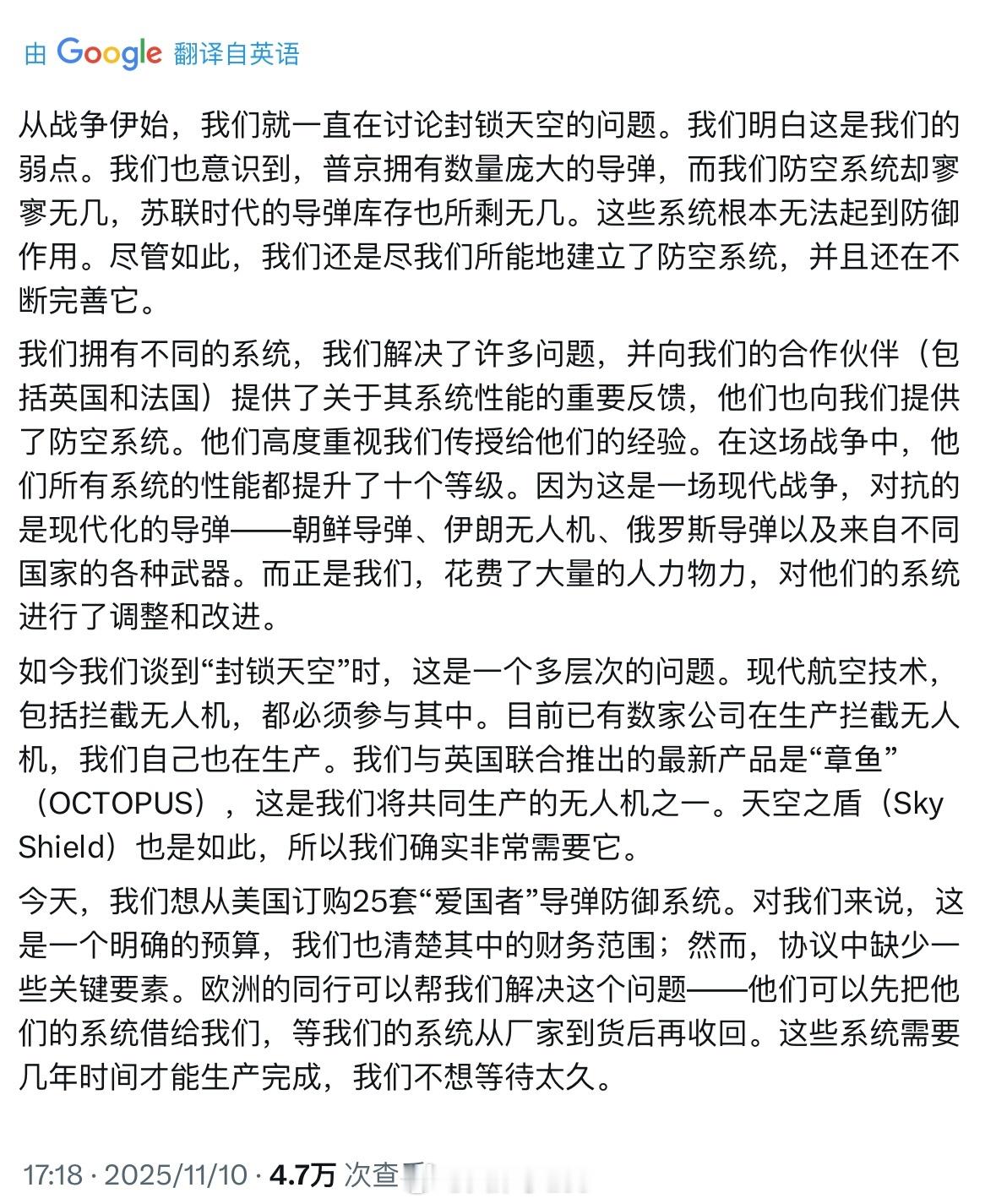 泽连斯基发文,狮子大开口想要25套“爱国者”、单套成本25亿美元,但美国生产要好几年;