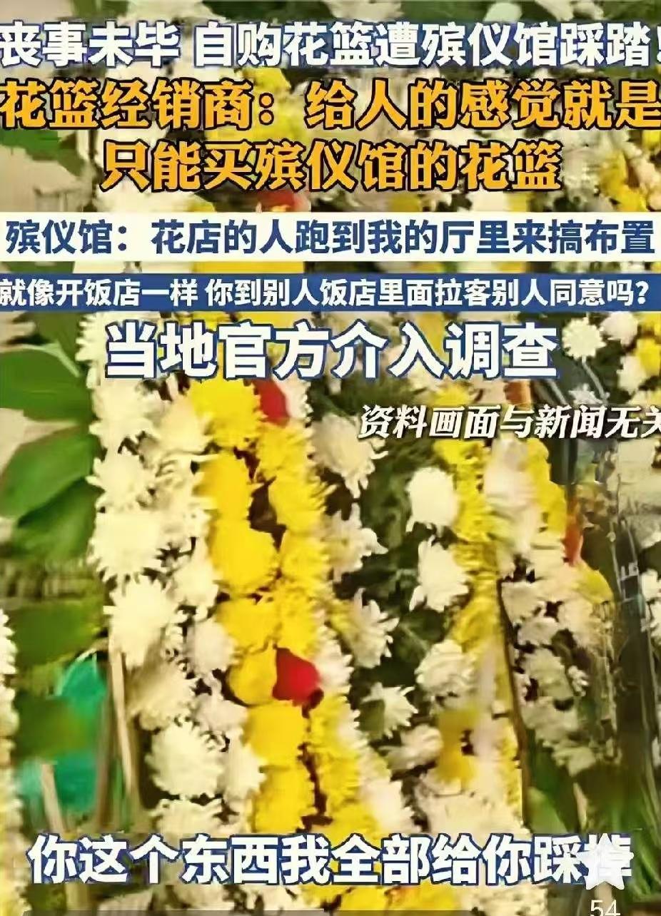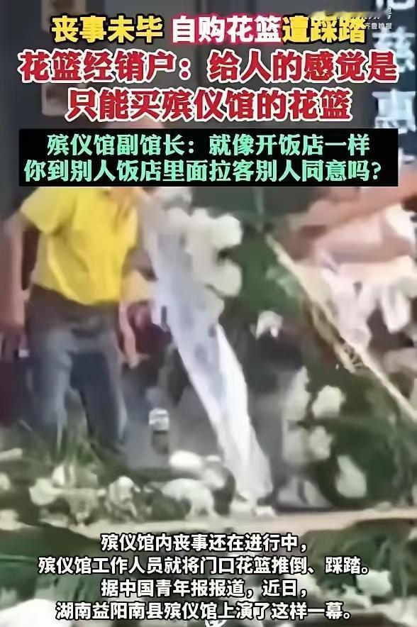 丧事未毕自购花篮遭踩踏,工作人员称抢生意引发热议,殡仪馆回应。 湖南益阳,事主一家正在殡仪馆办丧事,他们觉得馆里卖的花篮太贵,就从外面花店订了十几个,谁知,工作人员因为家属没在馆里买,竟趁家属还在跪拜时,冲上来把门口摆着的花篮全部掀翻踩踏在地。事主理论时,殡仪馆负责人的话让人气愤! 某殡仪馆,一场原本庄重肃穆的丧事,因工作人员的行为而横生波折。 逝者家属认为,殡仪馆内提供的花篮价格偏高,为了表达哀思又兼顾经济考量,他们选择了从外面的花店自行购买了十几个花篮,用以布置灵堂。 然而,丧事还没结束,家属仍在一旁守灵跪拜时,殡仪馆的工作人员却上前将这些自购的花篮推倒,甚至用脚进行踩踏。 根据现场目击者的说法,工作人员,只针对这些外部购买的木架子花篮进行了清理,而对殡仪馆提供的塑料架子花篮则未予理会。 这一行为,花店的经销商认为,根本原因在于他们销售的花篮抢占了殡仪馆的生意,从而引发了对方的针对行动。 而殡仪馆的工作人员,给出了他们的解释。 他们声称,之所以要清理这些鲜花,是为了统一拉到后方进行焚烧,目的是防止外面的花店,将这些花篮回收后进行二次销售。 然而,外部花店的经营者这样的说法并不认同。他们澄清,在向客户销售这些鲜花花篮时,确实会商议在葬礼后,有偿回收用于支撑花篮的木制架子。 但并非回收整个花篮再次售卖,木架子的循环使用与殡仪馆所说的“整个花篮回收再卖”并非同一概念。 而大家都知道,殡仪馆内对外租赁的花篮并非鲜花制品,其租赁价格在每个六十元或八十元。 而外面的花店,售卖的则是鲜花花篮,配有木制架子,售价在每个六十元或一百二十元。 价格上的差异,以及家属选择外部花篮的行为,肯定触及了殡仪馆的利益,所以他们才这么抵制。 该殡仪馆的一位副馆长在回应时,用了一个比喻来表明立场:“你有营业执照,有你的经营范围,就像开饭店一样,你到别人饭店里面拉客别人同意吗?” 另有工作人员,更是直言不讳地指出,花店的人跑到殡仪馆的厅内进行布置,是侵犯了其场地权益。 不过,该工作人员也承认,在丧事尚未完毕时就推倒、踩踏花篮,此种处置方式确实不当,并表示将改进处理方式。 此事经报道后,迅速引起了社会关注,和当地有关部门高度重视。 目前,当地的民政、发改以及市场监管等部门已介入,正就此事进行详细了解。 这起事件也引发了公众,对于殡葬服务行业一些现象的讨论。 在某些地方,类似的争议并非个例。据媒体报道,济南市某殡仪馆,曾出现守灵室鲜花套餐报价高达13800元的情况,后经协商降至3000元。 也有市民反映,殡仪馆骨灰盒,价格远高于市场价,甚至有供货商指出的售价是进货价近10倍的情况。 此外,审计局在审计中也发现某殡仪馆存在火化垫、纸棺等丧葬用品销售加价幅度过高的问题。 随后要求其纠正不合理定价,并按“保本微利”原则调整价格,相关用品价格平均降幅约百分之五十。 当逝者尊严与生者权益都得到尊重时,才能让身后事真正回归送别的本质。 那么,从法律角度,怎么看待殡仪馆方的行为? 《消费者权益保护法》第九条:消费者享有自主选择商品或者服务的权利。消费者有权自主选择提供商品或者服务的经营者,自主选择商品品种或者服务方式,自主决定购买或者不购买任何一种商品、接受或者不接受任何一项服务。 家属在殡仪馆外,自行购买花篮,是行使消费者的合法选择权。 殡仪馆工作人员以“抢生意”为由,破坏自购花篮,本质上是通过暴力手段强制消费者接受其高价服务,属于典型的强制交易行为。 这种行为,违反了消费者权益保护法中“不得强制交易”的规定,消费者有权拒绝并要求赔偿损失。 《民法典》第八条:民事主体从事民事活动,不得违反法律,不得违背公序良俗。 殡仪馆作为提供殡葬服务的公共场所,本应维护社会公共道德和善良风俗。 工作人员在丧事进行中,故意踩踏家属自购的花篮,不仅破坏了葬礼的庄重氛围,更伤害了家属的情感尊严。 这种行为违背了公序良俗原则,属于法律禁止的“违背社会公共利益和伦理道德”的行为,需承担相应的民事责任。 殡仪馆的行为,既侵犯了消费者的自主选择权,又违背了社会公序良俗。 此外,相关部门应对殡仪馆的垄断经营,和价格违法行为进行监管,保障消费者合法权益。 同时,消费者有权要求殡仪馆赔偿因花篮损毁造成的直接经济损失,或通过民事诉讼主张精神损害赔偿。 对此,你怎么看?