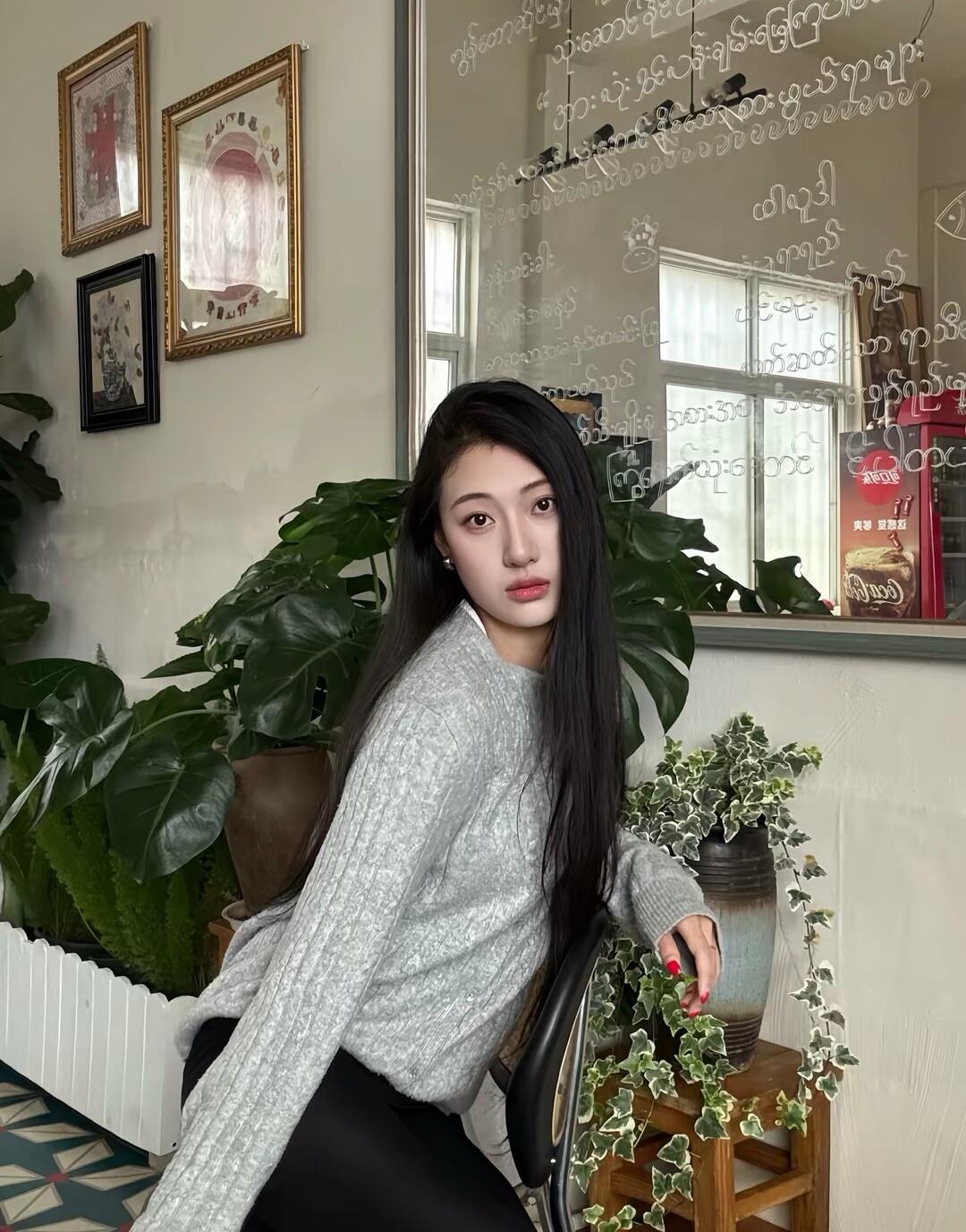 优雅咖啡馆里的甜美少女,绿植环绕,氛围温馨。