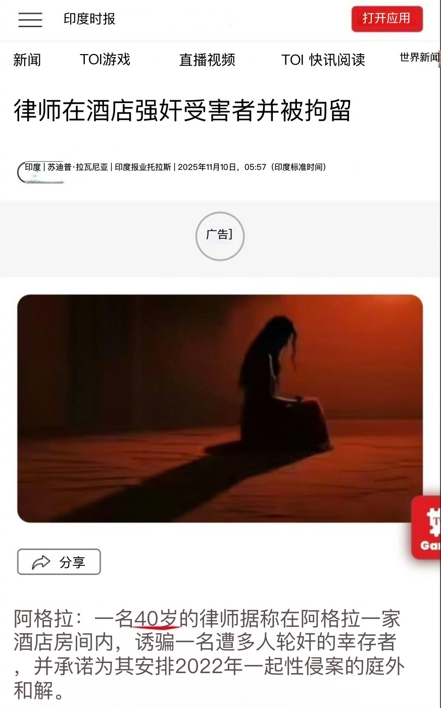 这名24岁的女生于2022年遭到3名男子轮奸,案件积压3年未决。Jitendra Singh是此案被告代理律师之一。上周四,女生参加轮奸案听证会,当天,Jitendra Singh找到她,称可以庭外调解此案,于是以讨论案情为由将她带到酒店并强奸了她。