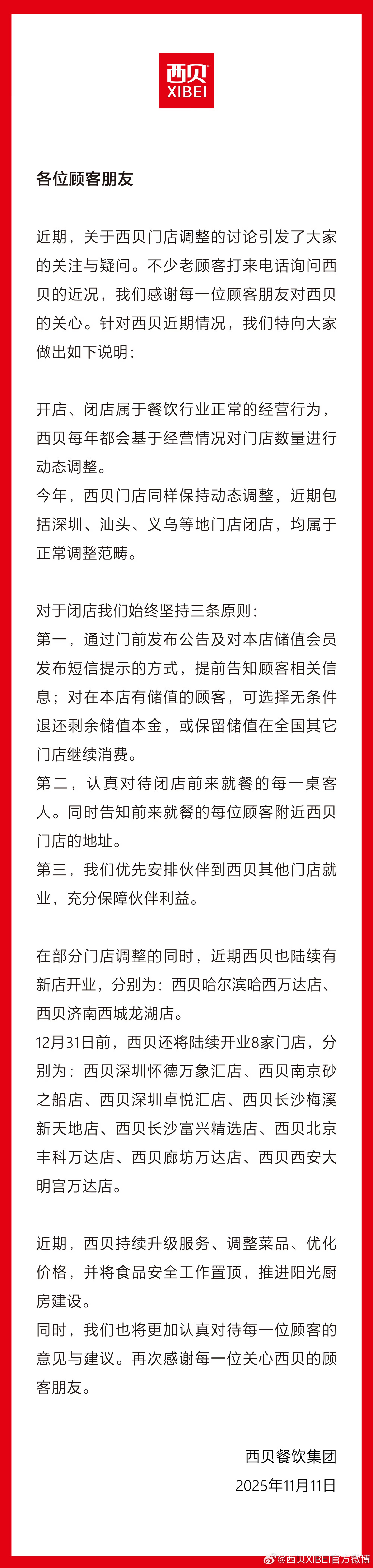 【西贝回应多地门店关闭】西贝称年底前还要开10家新店 11月11日,发文:就全国多地门店关闭一事,做出正式回应。回应里提到,开店、闭店属于餐饮行业正常的经营行为,西贝每年都会基于经营情况对门店数量进行动态调整。今年,西贝门店同样保持动态调整,近期包括深圳、汕头、义乌等地门店闭店,均属于正常调整范畴。