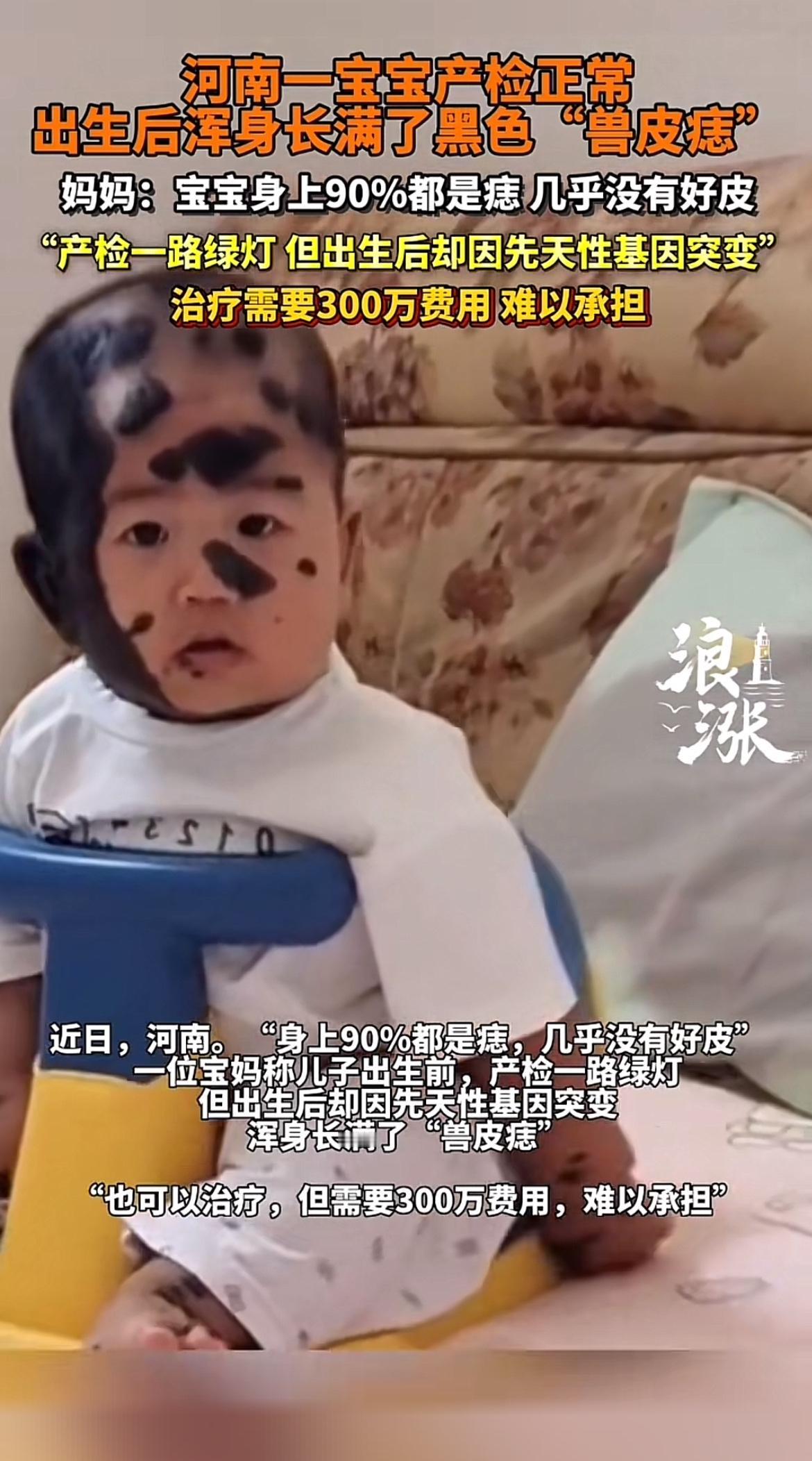今天看到一则新闻,河南一个宝宝出生后全身长满“兽皮痣”,身上90%都是痣,几乎没好皮。可宝妈说,宝宝出生前产检一路绿灯。医生说这是先天性基因突变导致的,还提到这类兽皮痣不易在产检中发现。 治疗费用更是个天文数字,要300万,这对普通家庭来说,简直是难以承受的重担。孩子小时候认知没完全形成,可能还好点,长大了很容易自卑。这事儿真让人揪心,希望医学能早日攻克这类难题,也希望宝宝能尽快好起来。