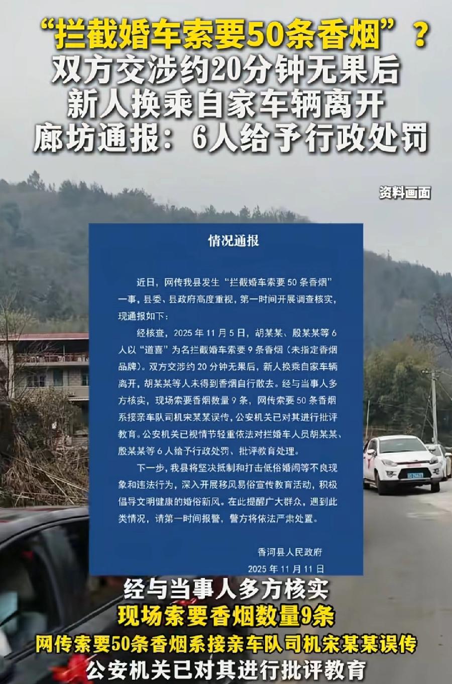 香河拦婚车要烟,9条烟价值1、2千,这是寻衅滋事罪!如果不是婚车,拦截、强拿硬要、公共场所起哄闹事,会怎么处理?拦婚车道喜,是传统习俗不错,可是现在已经严重变味了,只有拦劫,没有一点道喜! 如果要9根烟,哪怕9包,可以理解,整整9条,不排除网传,刚开始有人说50条!该耽误了人家的婚事,大好心情,这种歪风邪气必须严惩,比你情我愿的高价彩礼恶劣一万倍!
