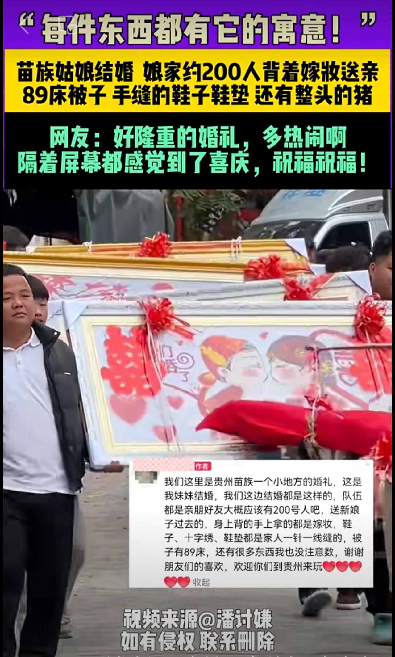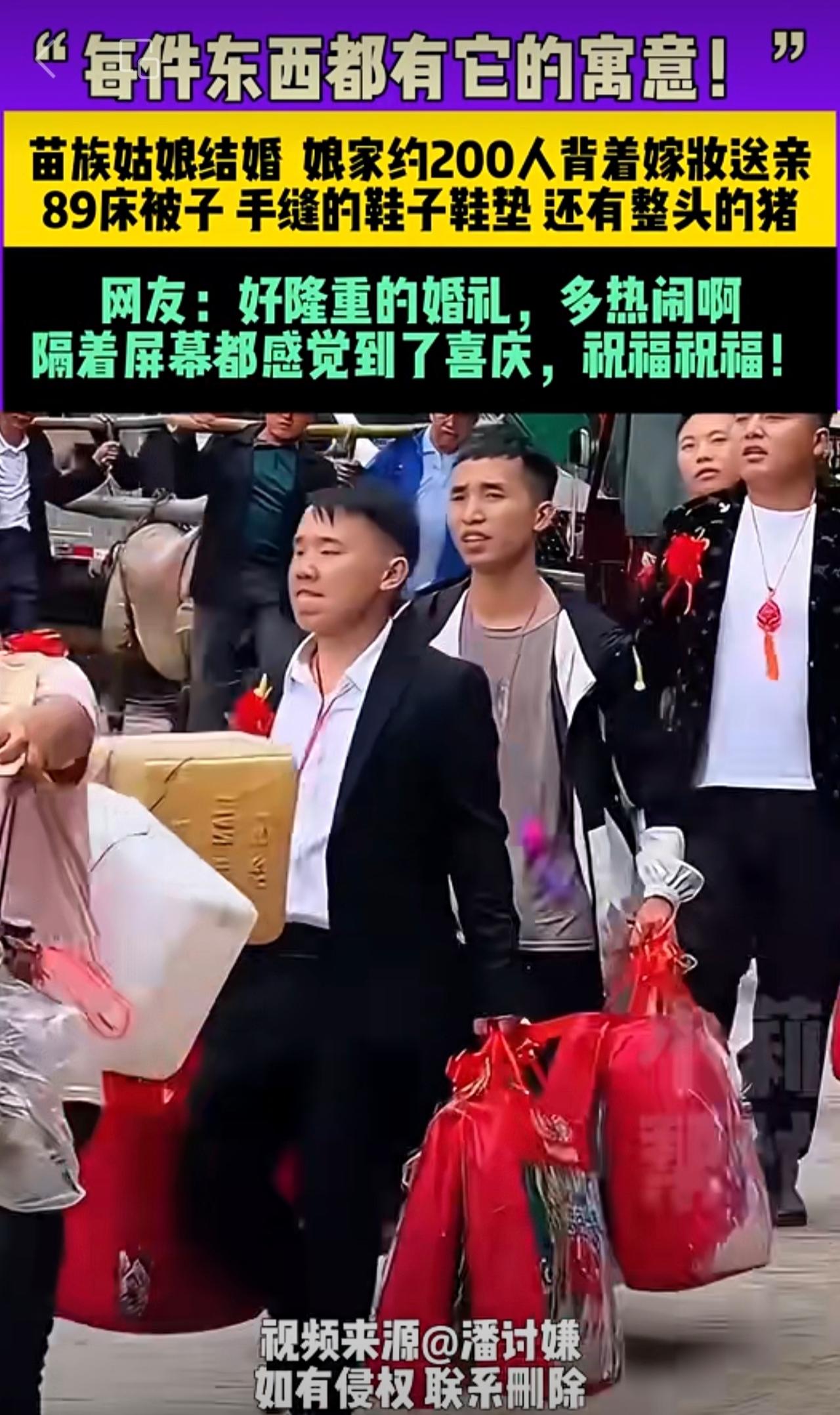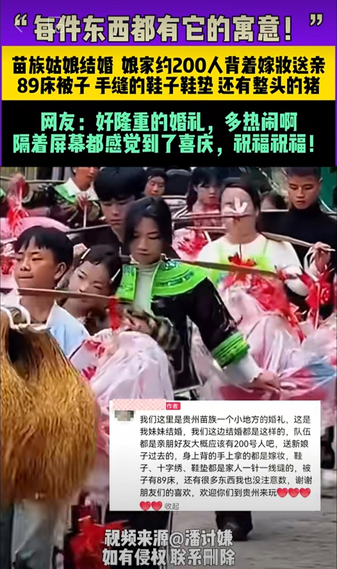 11月9日(发布),贵州,“每件东西都有它的寓意!”苗族姑娘结婚 娘家约200人背着嫁妆送亲,89床被子 手缝的鞋子鞋垫 还有整头的猪,网友:好隆重的婚礼,多热闹啊,隔着屏幕都感觉到了喜庆,祝福祝福!