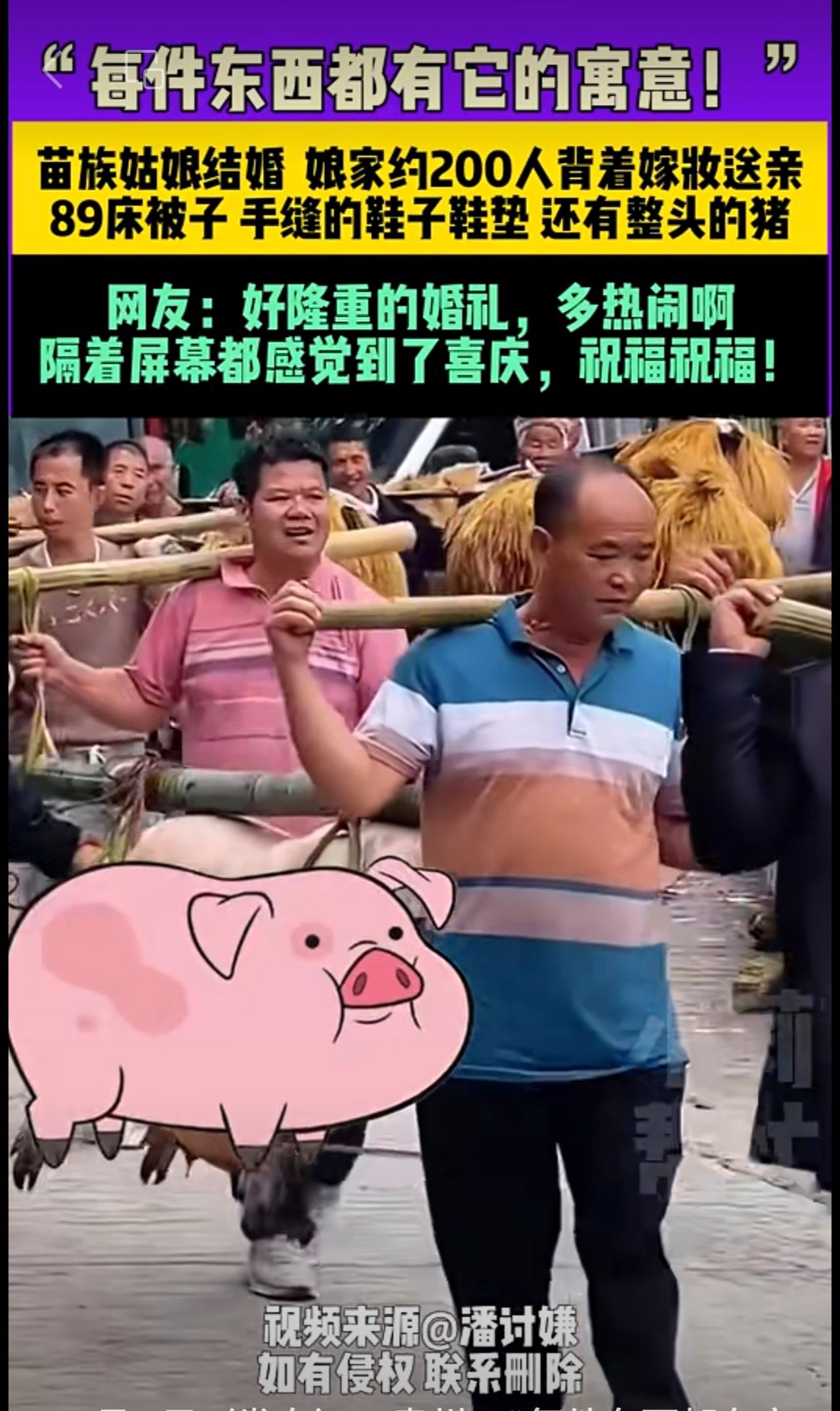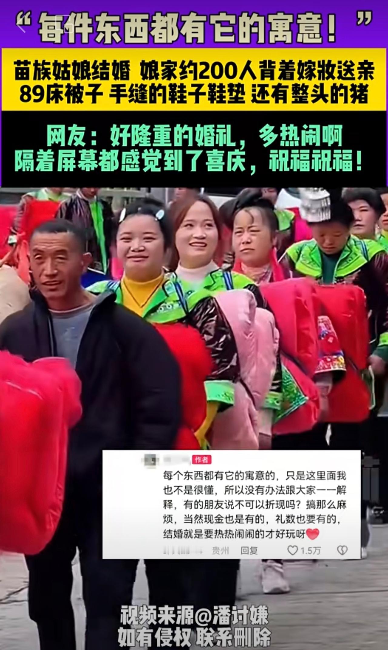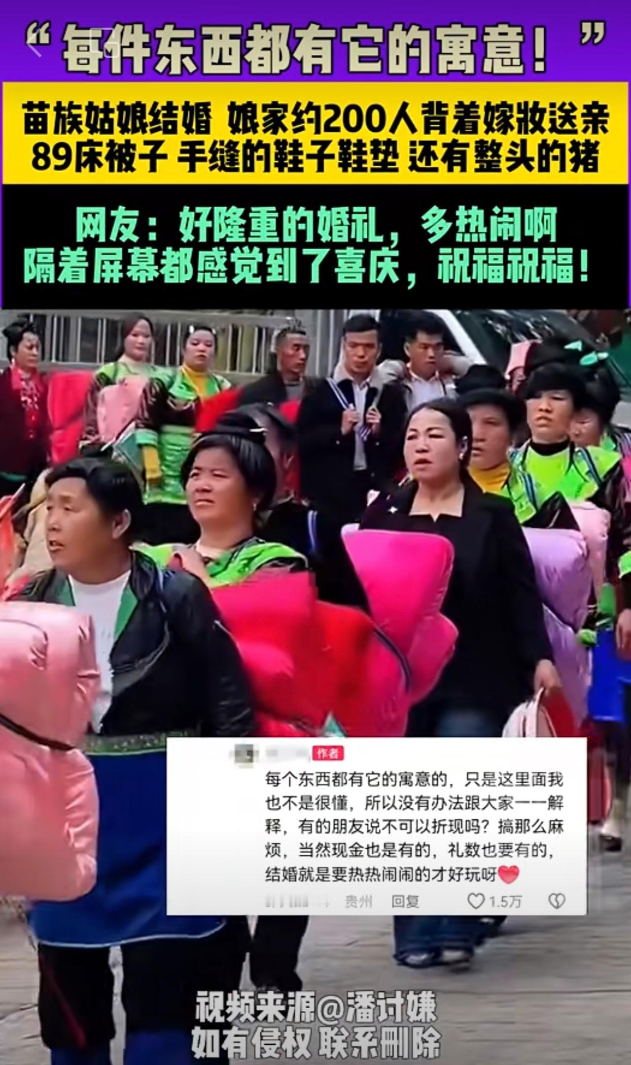 11月9日(发布),贵州,“每件东西都有它的寓意!”苗族姑娘结婚 娘家约200人背着嫁妆送亲,89床被子 手缝的鞋子鞋垫 还有整头的猪,网友:好隆重的婚礼,多热闹啊,隔着屏幕都感觉到了喜庆,祝福祝福!